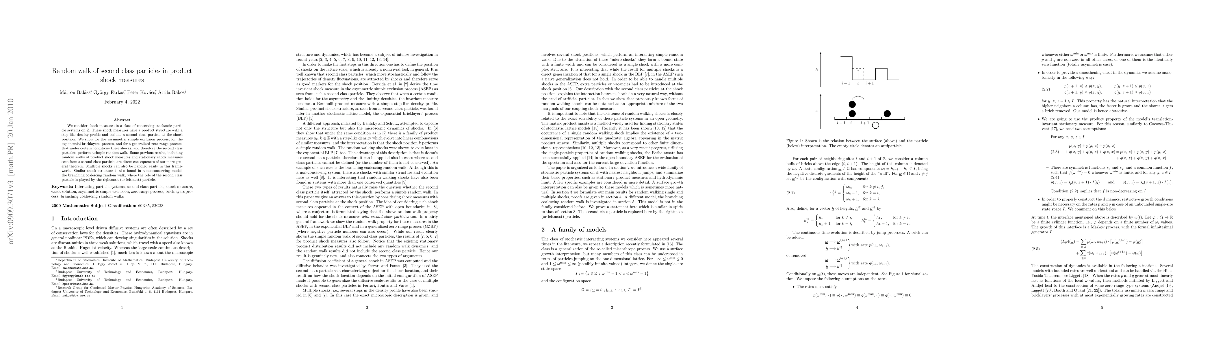 We consider shock measures in a class of conserving stochastic particle systems on Z. These shock measures have a product structure with a step-like density profile and include a second class particle at the shock position. We show for the asymmetric simple exclusion process, for the exponential bricklayers' process, and for a generalized zero range process, that under certain conditions these shocks, and therefore the second class particles, perform a simple random walk. Some previous results, including random walks of product shock measures and stationary shock measures seen from a second class particle, are direct consequences of our more general theorem. Multiple shocks can also be handled easily in this framework. Similar shock structure is also found in a nonconserving model, the branching coalescing random walk, where the role of the second class particle is played by the rightmost (or leftmost) particle.