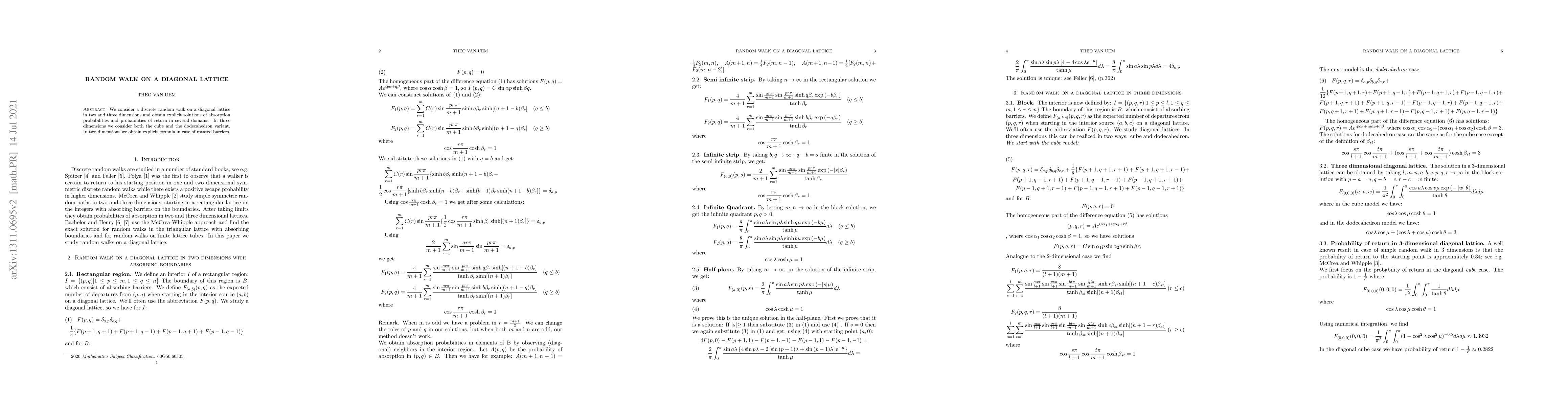 Researchers solved explicit solutions for absorption probabilities and return probabilities in random walks on diagonal lattices in 2D and 3D, with novel formulas derived for specific cases.