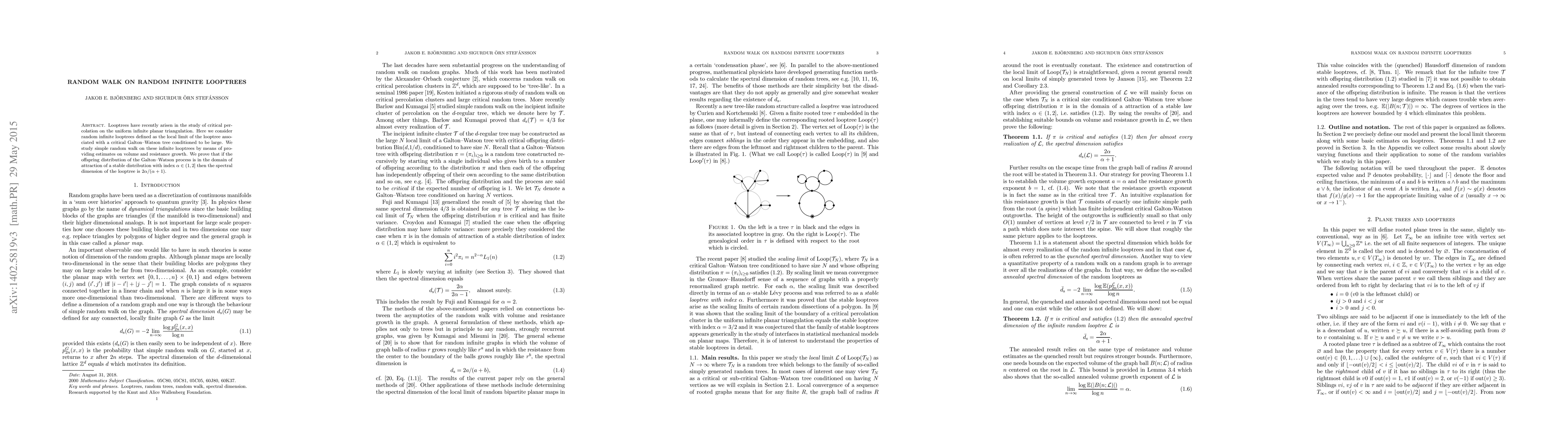 The paper investigates simple random walk on random infinite looptrees, derived from critical Galton-Watson trees conditioned to be large, and finds that the spectral dimension depends on the offspring distribution's stable distribution index, specifically yielding $2\alpha/(\alpha+1)$ when $\alpha \in (1,2]$.