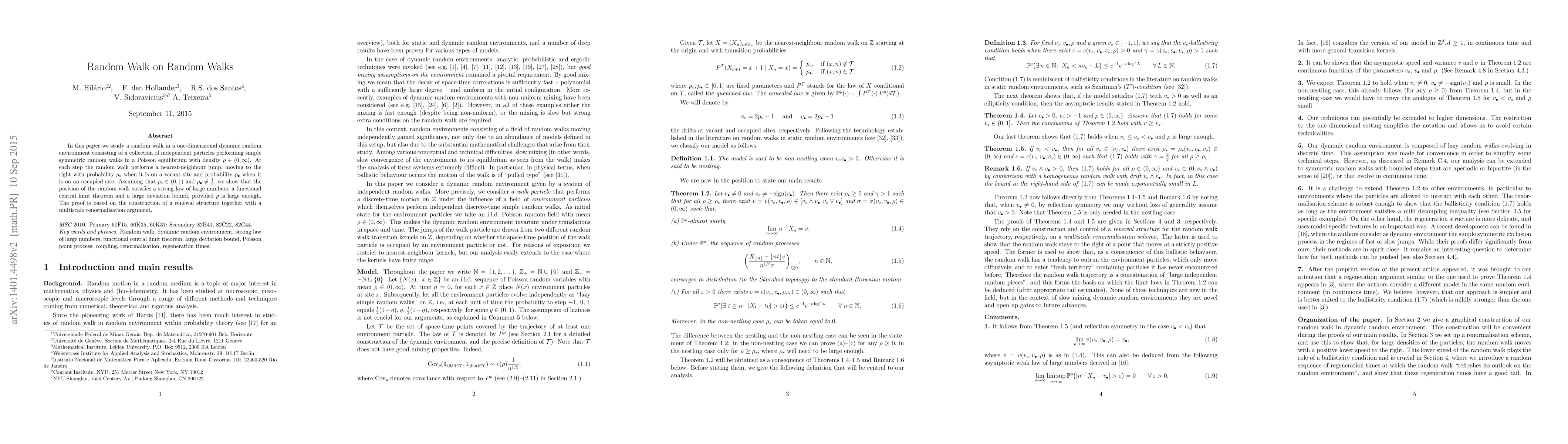 This paper investigates a random walk in a dynamic random environment where particles independently perform simple symmetric random walks. The study shows that under certain conditions, the position of the random walk obeys a strong law of large numbers, a functional central limit theorem, and a large deviation principle, using a renewal structure and multiscale renormalisation.