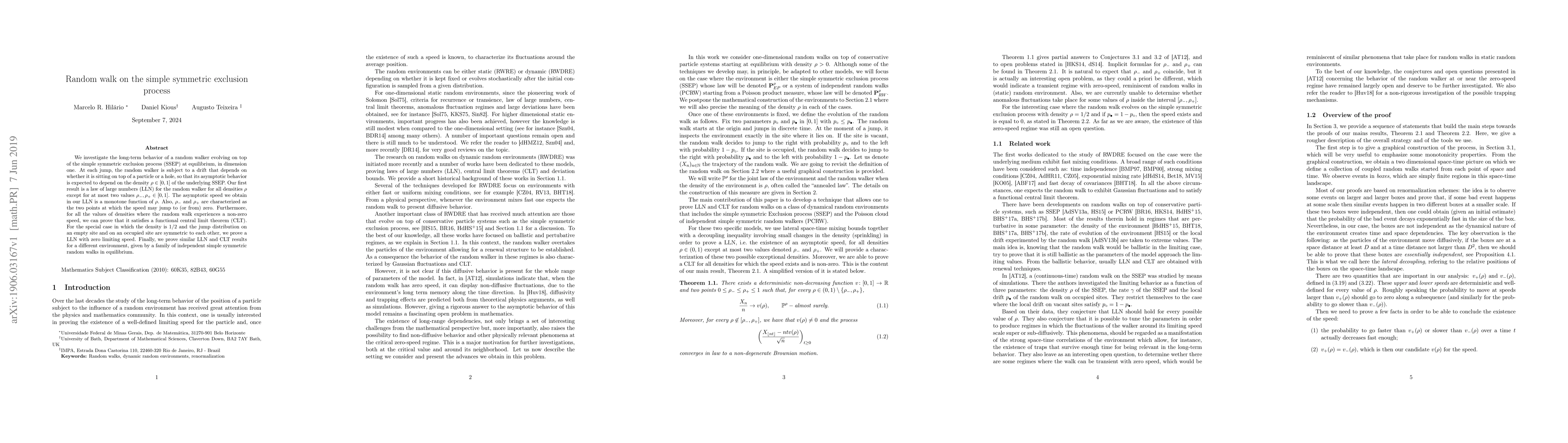 This paper studies the long-term behavior of a random walker on the simple symmetric exclusion process (SSEP) in one dimension, showing a law of large numbers (LLN) for all densities except at most two critical points. The asymptotic speed is a monotone function of the SSEP density and satisfies a functional central limit theorem (CLT) for non-zero speeds.