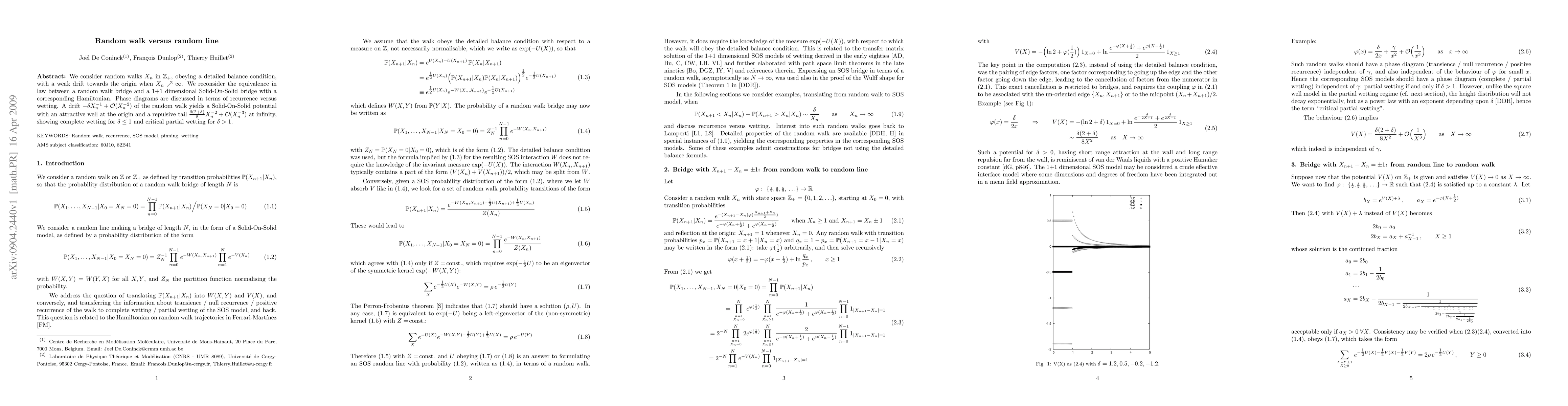 We consider random walks X_n in Z+, obeying a detailed balance condition, with a weak drift towards the origin when X_n tends to infinity. We reconsider the equivalence in law between a random walk bridge and a 1+1 dimensional Solid-On-Solid bridge with a corresponding Hamiltonian. Phase diagrams are discussed in terms of recurrence versus wetting. A drift -delta/X_n of the random walk yields a Solid-On-Solid potential with an attractive well at the origin and a repulsive tail delta(delta+2)/(8X_n^2) at infinity, showing complete wetting for delta<=1 and critical partial wetting for delta>1.