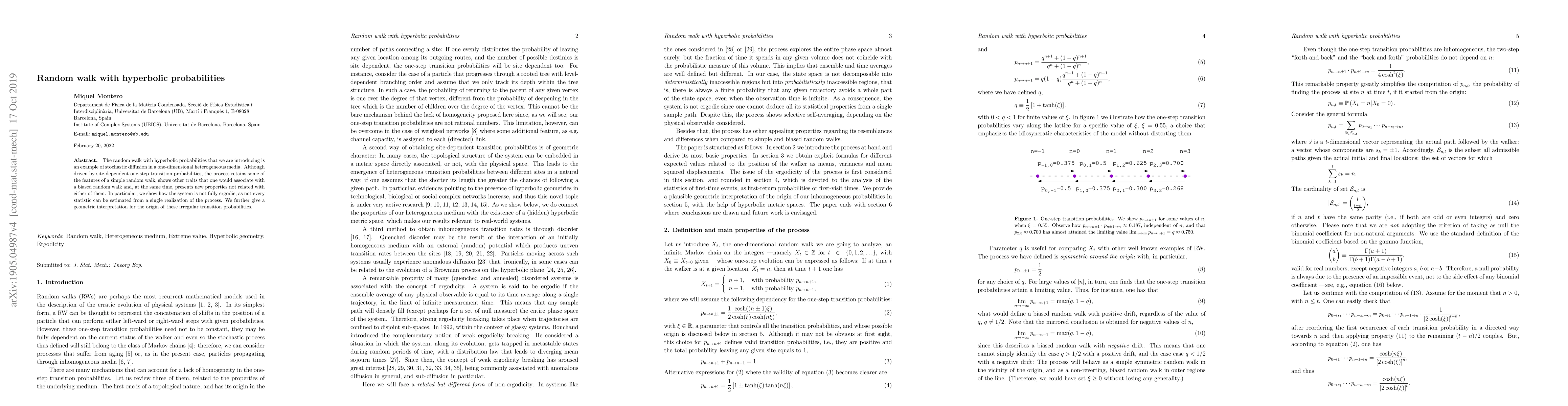 The random walk with hyperbolic probabilities that we are introducing is an example of stochastic diffusion in a one-dimensional heterogeneous media. Although driven by site-dependent one-step transition probabilities, the process retains some of the features of a simple random walk, shows other traits that one would associate with a biased random walk and, at the same time, presents new properties not related with either of them. In particular, we show how the system is not fully ergodic, as not every statistic can be estimated from a single realization of the process. We further give a geometric interpretation for the origin of these irregular transition probabilities.