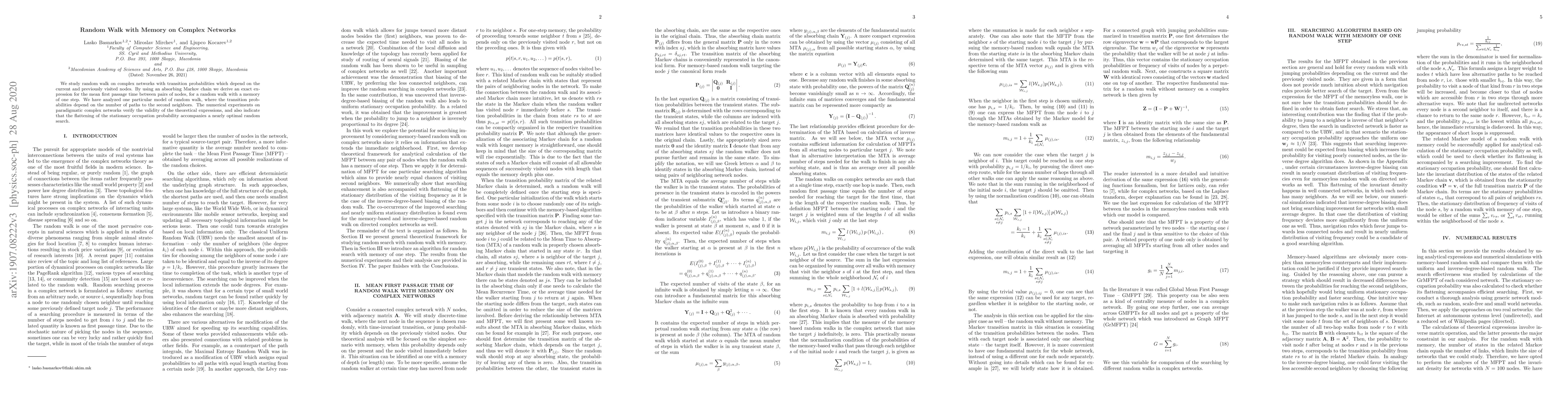 This paper investigates random walk dynamics on complex networks where transition probabilities depend on both current and previously visited nodes. It derives an exact expression for mean first passage time using an absorbing Markov chain, focusing on a model where transitions depend on second-neighbor paths, and confirms theoretical results with numerical experiments on complex networks.