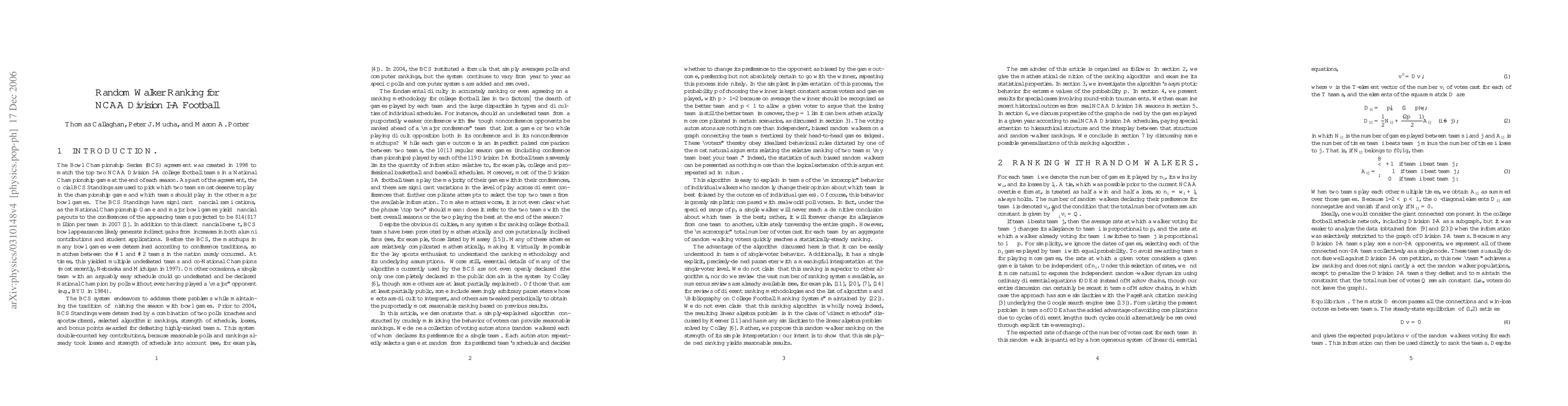 Each December, college football fans and pundits across America debate which two teams should meet in the NCAA Division I-A National Championship game. The Bowl Championship Series (BCS) standings employed to select the teams invited to this game are intended to provide an unequivocal #1 v. #2 game for the championship; however, this selection process has itself been highly controversial in recent years. The computer algorithms that constitute one part of the BCS standings often act as lightning rods for the controversy, in part because they are inadequately explained to the public. We present an alternative algorithm that is simply explained yet remains effective at ranking the best teams. We define a ranking in terms of biased random walkers on the graph formed by the schedule of games played, with two teams (vertices) connected by an edge if they played each other. Each random walker moves from team to team by selecting a game and "voting" for its winner with probability p, tracing out a never-ending path motivated by the "my team beat your team" argument. We study the statistical properties of a collection of such walkers, relate the rankings to the community structure of the underlying network, and demonstrate the results for recent NCAA Division I-A seasons. We also discuss the algorithm's asymptotic behavior, illustrated with some analytically tractable cases for round-robin tournaments, and discuss possible generalizations.