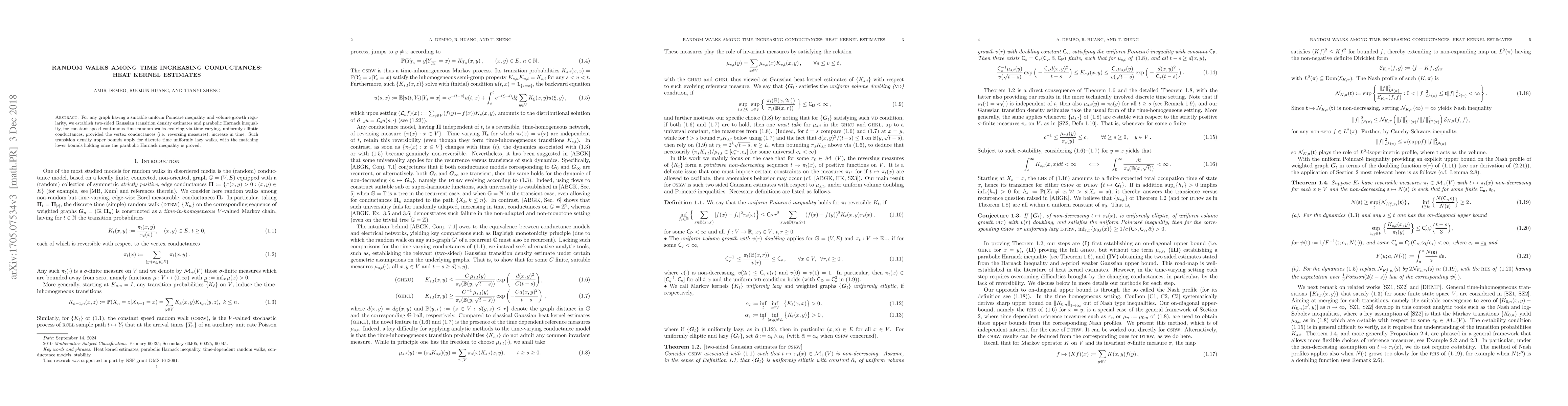 This paper establishes Gaussian heat kernel estimates and a parabolic Harnack inequality for random walks on graphs with time-varying conductances that increase over time, ensuring two-sided transition density bounds and uniform ellipticity. The results also extend to discrete time uniformly lazy walks.