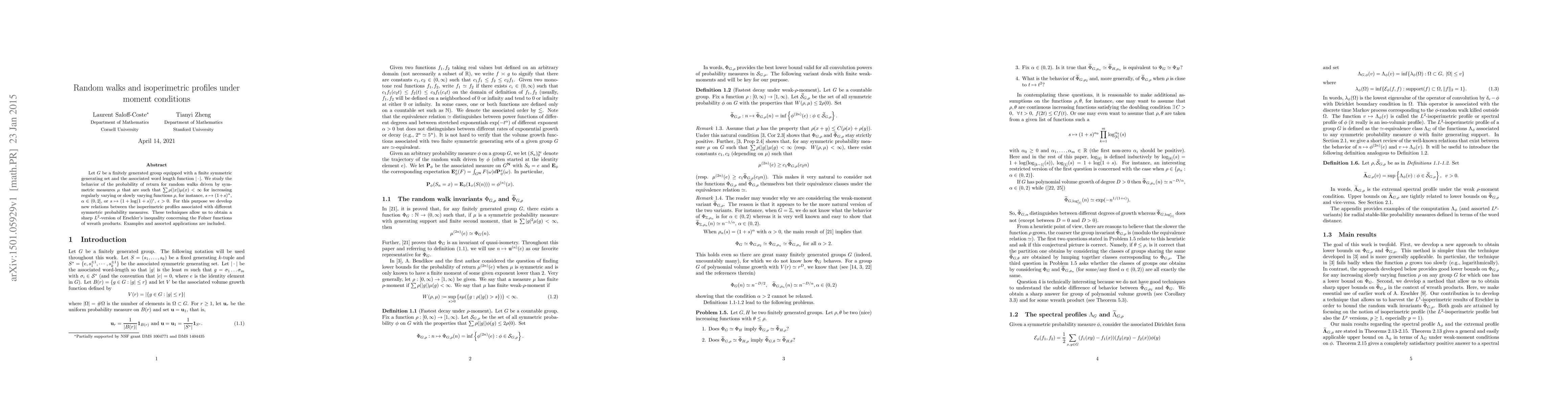 Let $G$ be a finitely generated group equipped with a finite symmetric generating set and the associated word length function $|\cdot |$. We study the behavior of the probability of return for random walks driven by symmetric measures $\mu$ that are such that $\sum \rho(|x|)\mu(x)<\infty$ for increasing regularly varying or slowly varying functions $\rho$, for instance, $s\mapsto (1+s)^\alpha$, $\alpha\in (0,2]$, or $s\mapsto (1+\log (1+s))^\epsilon$, $\epsilon>0$. For this purpose we develop new relations between the isoperimetric profiles associated with different symmetric probability measures. These techniques allow us to obtain a sharp $L^2$-version of Erschler's inequality concerning the F\o lner functions of wreath products. Examples and assorted applications are included.