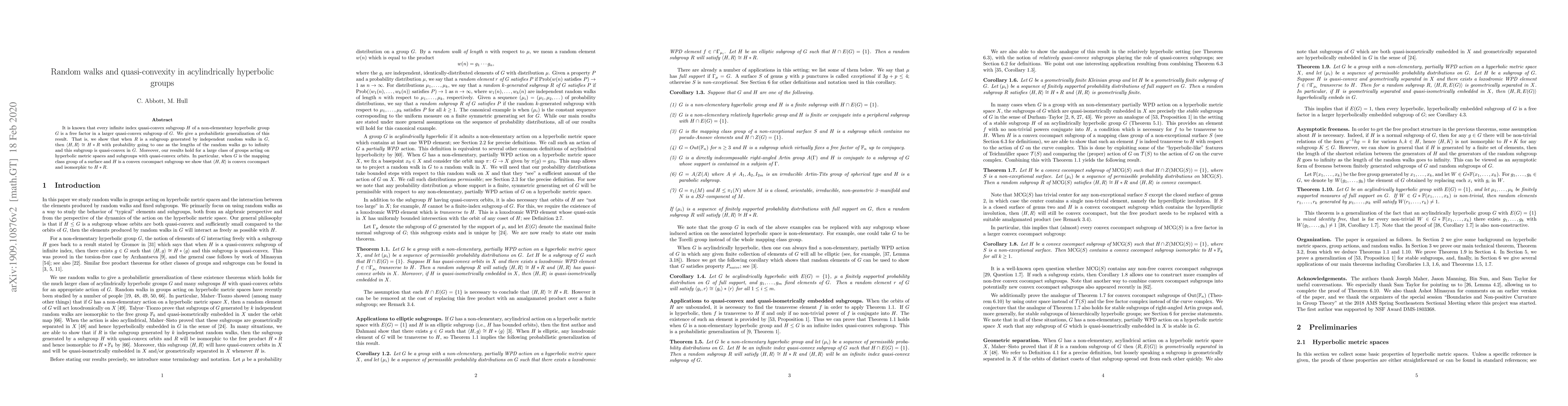 It is known that every infinite index quasi-convex subgroup $H$ of a non-elementary hyperbolic group $G$ is a free factor in a larger quasi-convex subgroup of $G$. We give a probabilistic generalization of this result. That is, we show that when $R$ is a subgroup generated by independent random walks in $G$, then $\langle H, R\rangle\cong H\ast R$ with probability going to one as the lengths of the random walks go to infinity and this subgroup is quasi-convex in $G$. Moreover, our results hold for a large class of groups acting on hyperbolic metric spaces and subgroups with quasi-convex orbits. In particular, when $G$ is the mapping class group of a surface and $H$ is a convex cocompact subgroup we show that $\langle H, R\rangle$ is convex cocompact and isomorphic to $ H\ast R$.