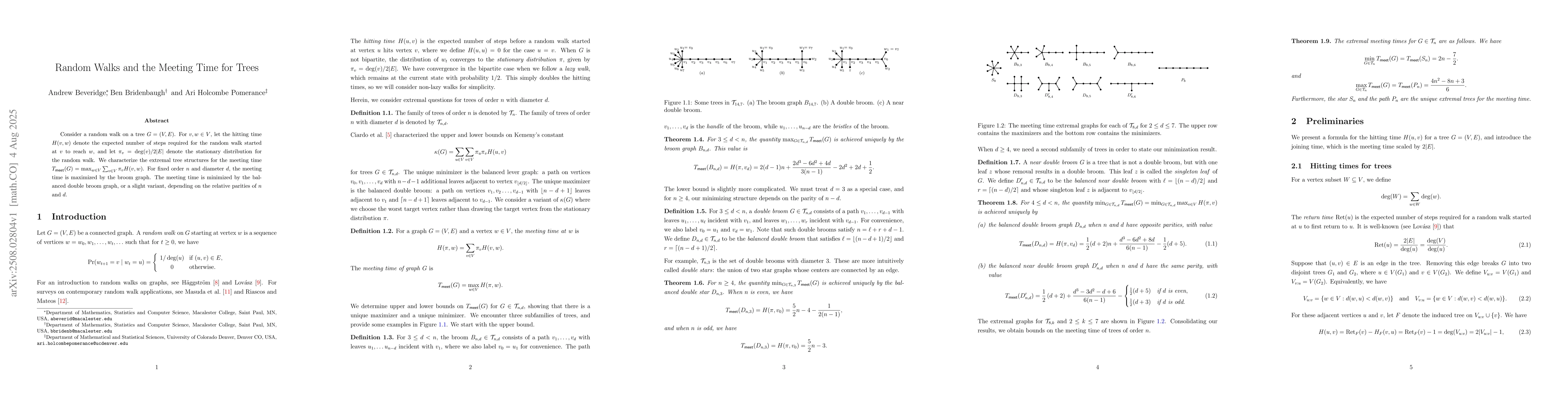 Consider a random walk on a tree $G=(V,E)$. For $v,w \in V$, let the hitting time $H(v,w)$ denote the expected number of steps required for the random walk started at $v$ to reach $w$, and let $\pi_v = \mathrm{deg}(v)/2|E|$ denote the stationary distribution for the random walk. We characterize the extremal tree structures for the meeting time $T_{\mathrm{meet}}(G) = \max_{w \in V} \sum_{v \in V} \pi_v H(v,w)$. For fixed order $n$ and diameter $d$, the meeting time is maximized by the broom graph. The meeting time is minimized by the balanced double broom graph, or a slight variant, depending on the relative parities of $n$ and $d$.