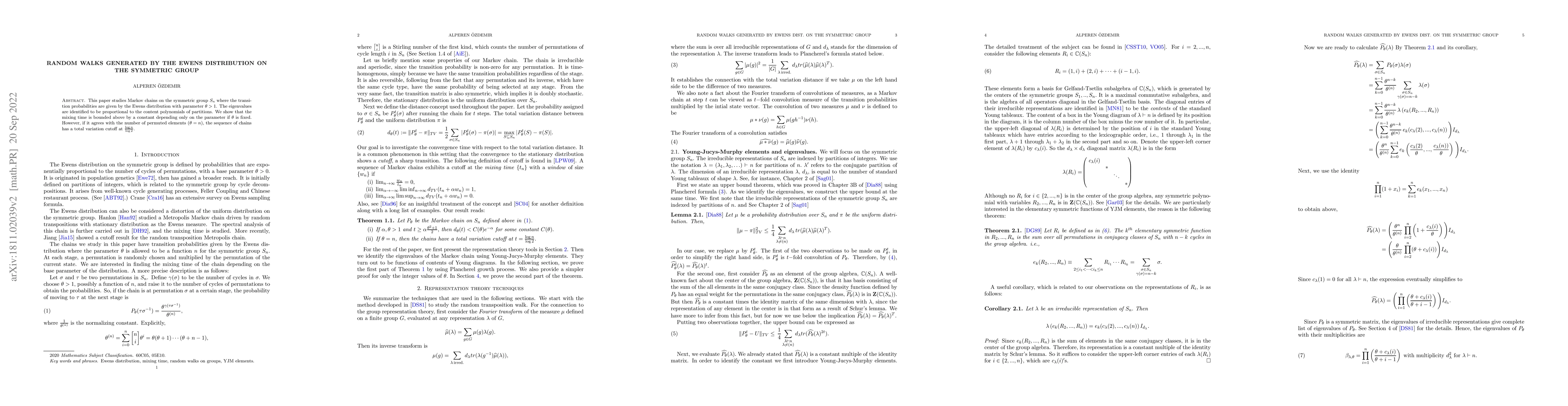 This paper investigates Markov chains on the symmetric group $S_n$ driven by the Ewens distribution, revealing that their eigenvalues relate to content polynomials. The mixing time is shown to be bounded if $\theta$ is fixed, but exhibits a total variation cutoff when $\theta=n$.