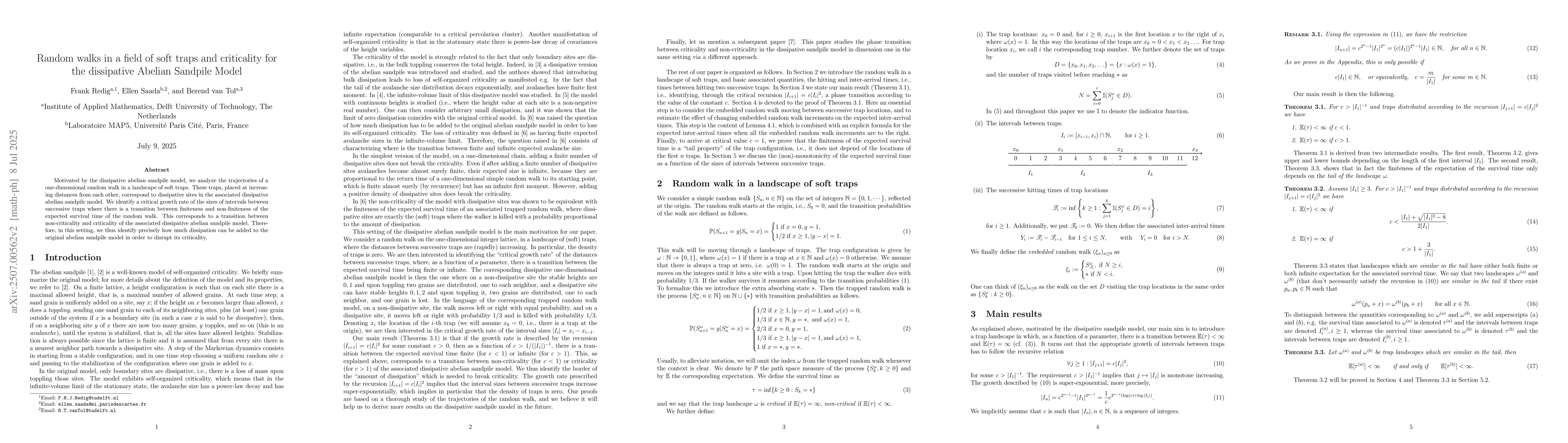 Motivated by the dissipative abelian sandpile model, we analyze the trajectories of a one-dimensional random walk in a landscape of soft traps. These traps, placed at increasing distances from each other, correspond to dissipative sites in the associated dissipative abelian sandpile model. We identify a critical growth rate of the sizes of intervals between successive traps where there is a transition between finiteness and non-finiteness of the expected survival time of the random walk. This corresponds to a transition between non-criticality and criticality of the associated dissipative abelian sandpile model. Therefore, in this setting, we thus identify precisely how much dissipation can be added to the original abelian sandpile model in order to disrupt its criticality.