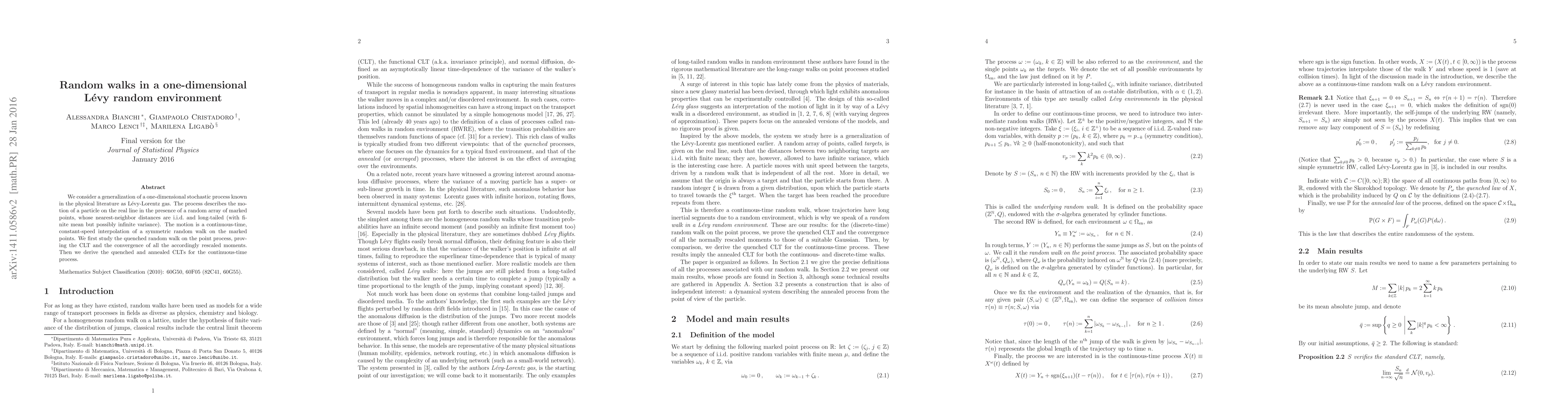 This paper generalizes a one-dimensional stochastic process called the Lévy-Lorentz gas, describing particle motion in a random environment with long-tailed nearest-neighbor distances. The authors prove the Central Limit Theorem (CLT) and convergence of rescaled moments for the random walk on the point process, and derive both quenched and annealed CLTs for the continuous-time process.