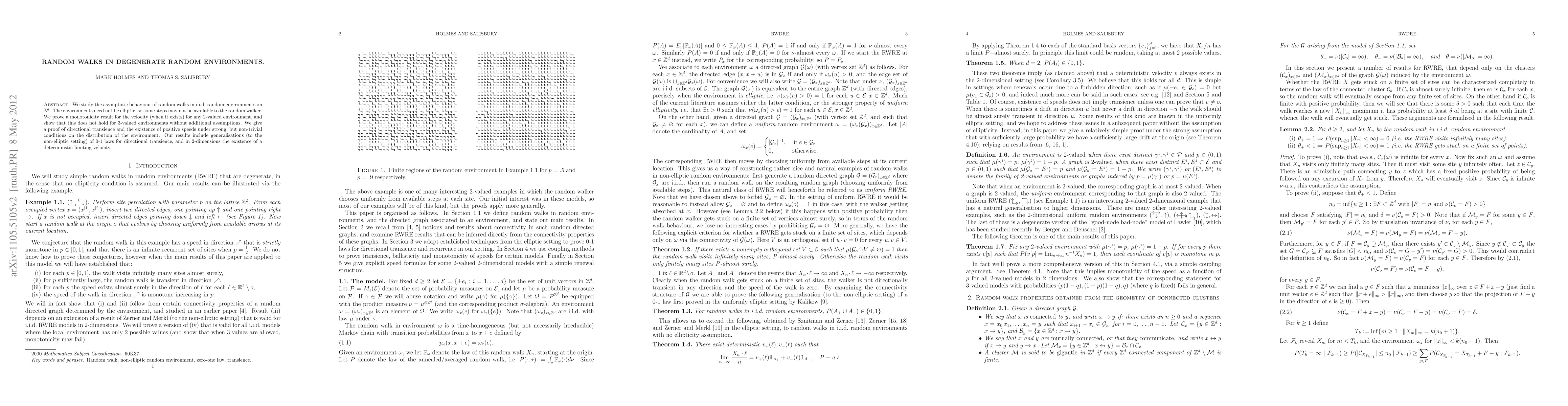 We study the asymptotic behaviour of random walks in i.i.d. random environments on $\Z^d$. The environments need not be elliptic, so some steps may not be available to the random walker. We prove a monotonicity result for the velocity (when it exists) for any 2-valued environment, and show that this does not hold for 3-valued environments without additional assumptions. We give a proof of directional transience and the existence of positive speeds under strong, but non-trivial conditions on the distribution of the environment. Our results include generalisations (to the non-elliptic setting) of 0-1 laws for directional transience, and in 2-dimensions the existence of a deterministic limiting velocity.