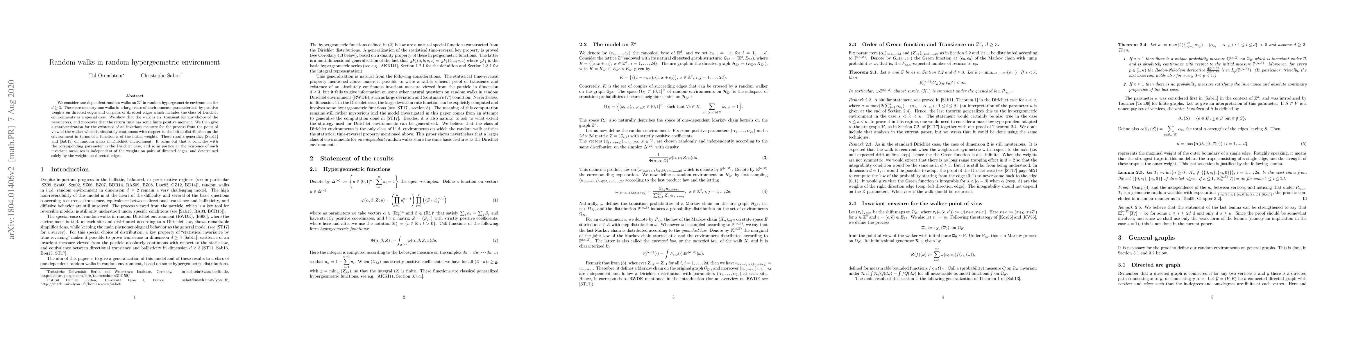 This paper explores one-dependent random walks in random hypergeometric environments on $\mathbb{Z}^d$ for $d\ge 3$, proving their almost sure transience and finite positive moment return times. The study also characterizes the existence of invariant measures based on a function $\kappa$ dependent solely on weights on directed edges.