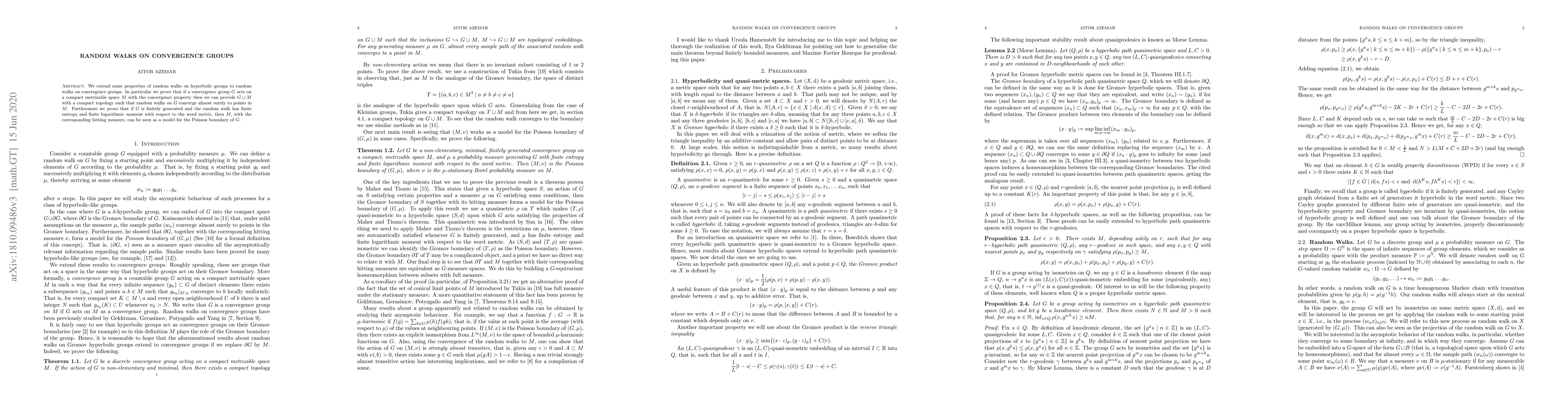 The paper extends properties of random walks on hyperbolic groups to convergence groups, proving that if a convergence group G acts on a compact metrizable space M with the convergence property, G ∪ M can be given a compact topology where random walks on G converge almost surely to points in M.