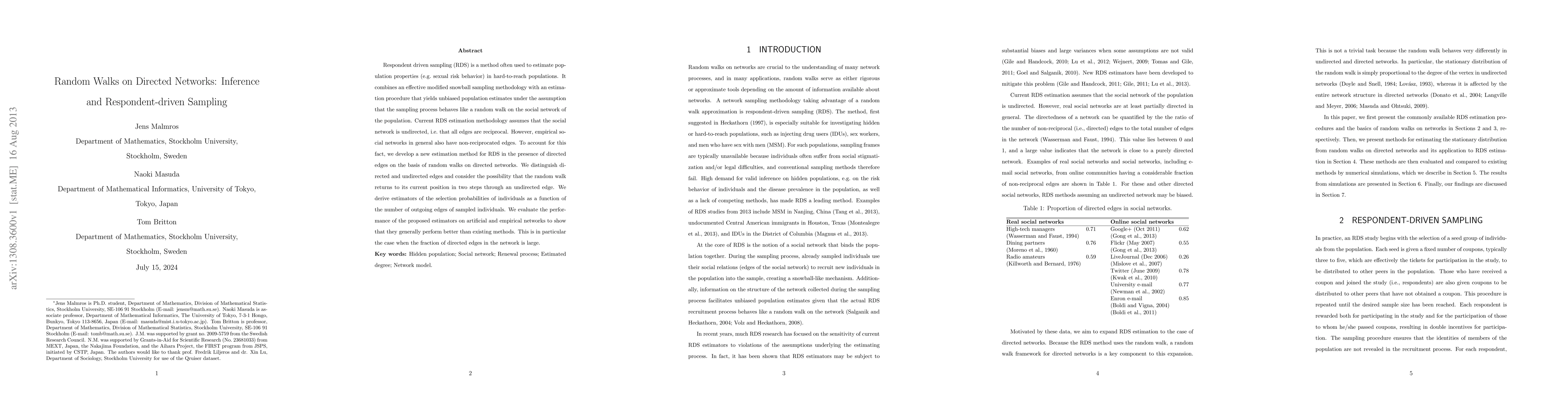 This paper proposes a new estimation method for respondent-driven sampling (RDS) that accounts for directed edges in social networks, improving upon existing undirected network assumptions. The method uses random walks on directed networks and shows better performance, especially in networks with many directed edges.