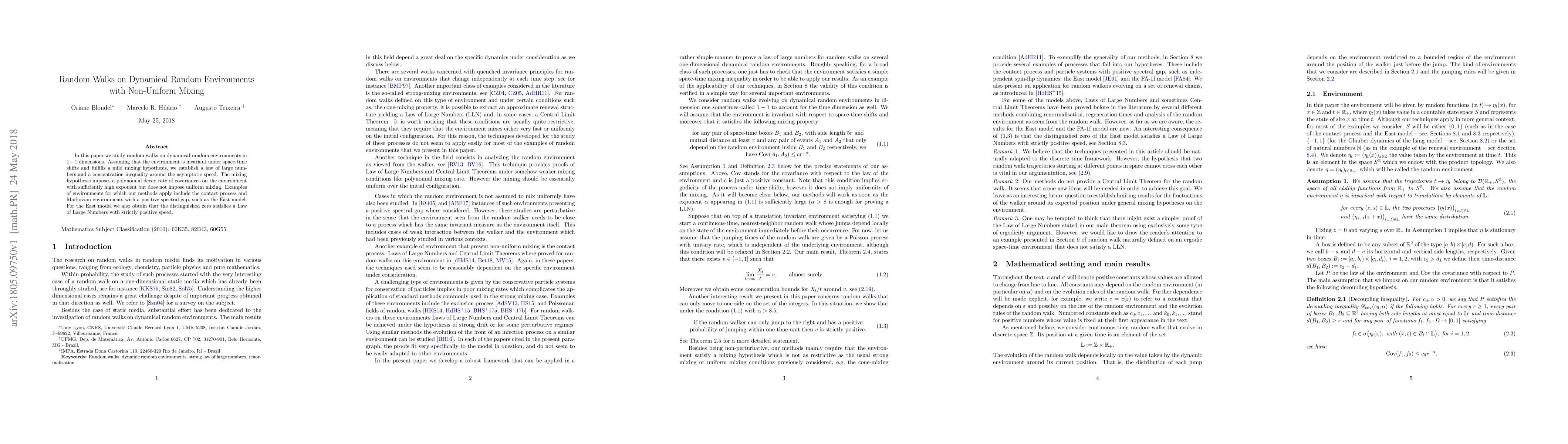 In this paper we study random walks on dynamical random environments in $1 + 1$ dimensions. Assuming that the environment is invariant under space-time shifts and fulfills a mild mixing hypothesis, we establish a law of large numbers and a concentration inequality around the asymptotic speed. The mixing hypothesis imposes a polynomial decay rate of covariances on the environment with sufficiently high exponent but does not impose uniform mixing. Examples of environments for which our methods apply include the contact process and Markovian environments with a positive spectral gap, such as the East model. For the East model we also obtain that the distinguished zero satisfies a Law of Large Numbers with strictly positive speed.
