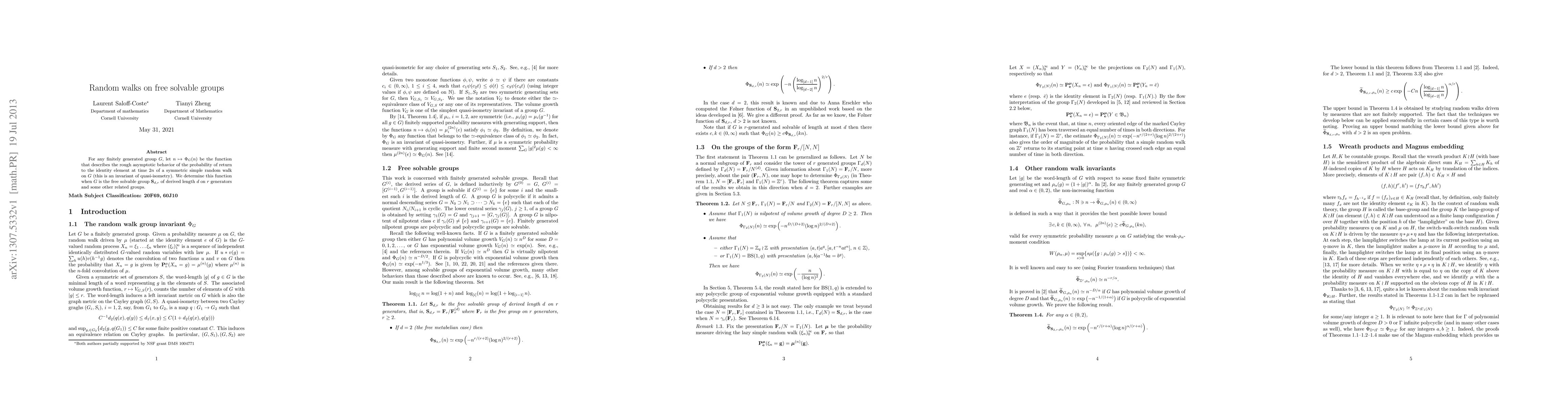 This paper determines the asymptotic behavior of the return probability to the identity element for symmetric simple random walks on free solvable groups, establishing the function \Phi_G(n) for these groups and related structures. The results provide insights into the quasi-isometry invariant of such groups.