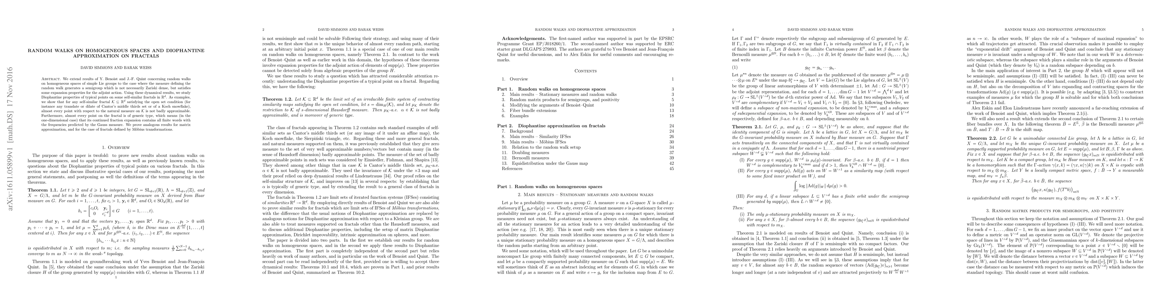 We extend results of Y. Benoist and J.-F. Quint concerning random walks on homogeneous spaces of simple Lie groups to the case where the measure defining the random walk generates a semigroup which is not necessarily Zariski dense, but satisfies some expansion properties for the adjoint action. Using these dynamical results, we study diophantine properties of typical points on some self-similar fractals in R^d. As examples, we show that for any self-similar fractal K in R^d satisfying the open set condition (for instance any translate or dilate of Cantor's middle thirds set or of a Koch snowflake), almost every point with respect to the natural measure on K is not badly approximable. Furthermore, almost every point on the fractal is of generic type, which implies (in the one dimensional case) that its continued fraction expansion contains all finite words with the frequencies predicted by Gauss measure. We prove analogous results for matrix multiplication, and for the case of fractals defined by Mobius transformation.