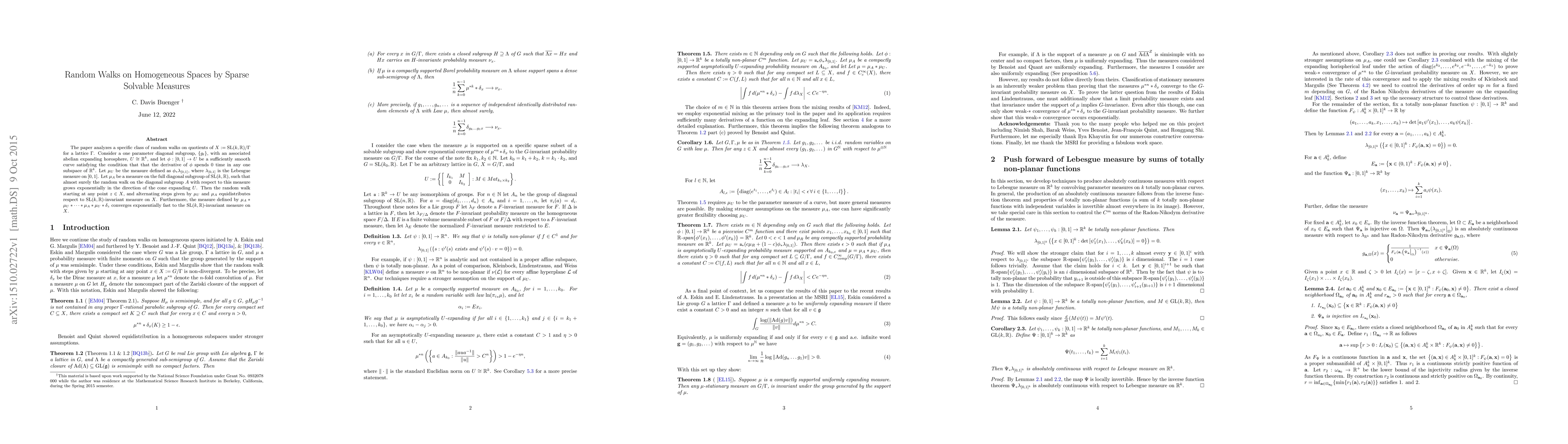 The paper analyzes a specific class of random walks on quotients of $X:=\text{SL}(k,{\Bbb R})/ \Gamma$ for a lattice $\Gamma$. Consider a one parameter diagonal subgroup, $\{g_t\}$, with an associated abelian expanding horosphere, $U\cong {\Bbb R}^k$, and let $\phi:[0,1]\rightarrow U$ be a sufficiently smooth curve satisfying the condition that that the derivative of $\phi$ spends $0$ time in any one subspace of ${\Bbb R}^k$. Let $ \mu_U$ be the measure defined as $\phi_*\lambda_{[0,1]},$ where $\lambda_{[0,1]}$ is the Lebesgue measure on $[0,1]$. Let $\mu_A$ be a measure on the full diagonal subgroup of $\text{SL}(k,{\Bbb R})$, such that almost surely the random walk on the diagonal subgroup $A$ with respect to this measure grows exponentially in the direction of the cone expanding $U$. Then the random walk starting at any point $z\in X$, and alternating steps given by $\mu_U$ and $\mu_A$ equidistributes respect to $\text{SL}(k,{\Bbb R})$-invariant measure on $X$. Furthermore, the measure defined by $\mu_A*\mu_U*\dots*\mu_A* \mu_U*\delta_z$ converges exponentially fast to the $\text{SL}(k,{\Bbb R})$-invariant measure on $X$.