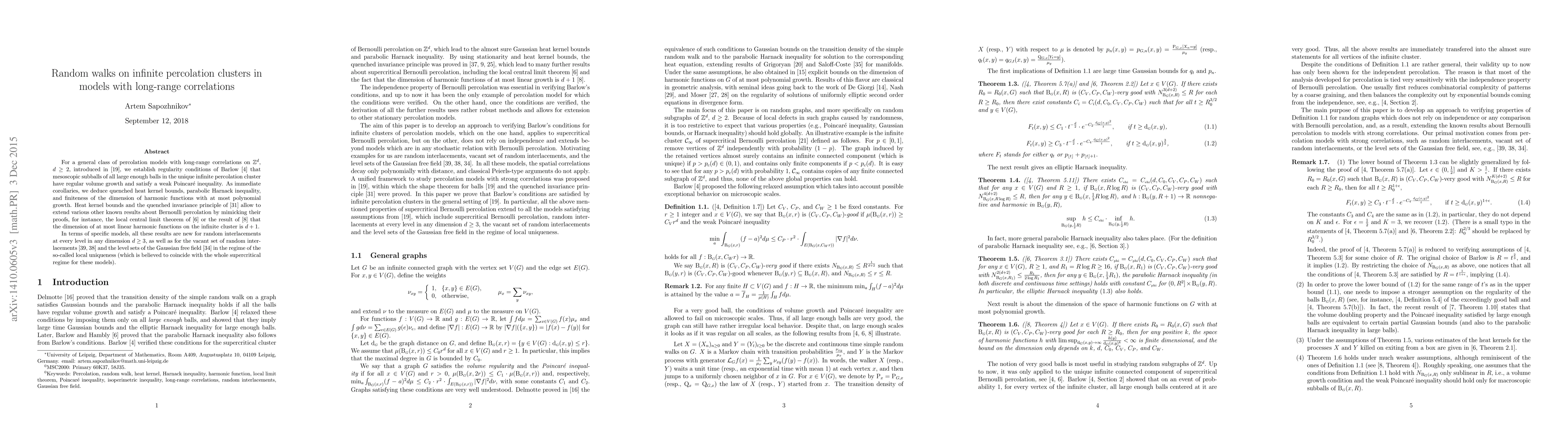 For a general class of percolation models with long-range correlations on $\mathbb Z^d$, $d\geq 2$, introduced in arXiv:1212.2885, we establish regularity conditions of Barlow arXiv:math/0302004 that mesoscopic subballs of all large enough balls in the unique infinite percolation cluster have regular volume growth and satisfy a weak Poincar\'e inequality. As immediate corollaries, we deduce quenched heat kernel bounds, parabolic Harnack inequality, and finiteness of the dimension of harmonic functions with at most polynomial growth. Heat kernel bounds and the quenched invariance principle of arXiv:1310.4764 allow to extend various other known results about Bernoulli percolation by mimicking their proofs, for instance, the local central limit theorem of arXiv:0810.2467 or the result of arXiv:1111.4853 that the dimension of at most linear harmonic functions on the infinite cluster is $d+1$. In terms of specific models, all these results are new for random interlacements at every level in any dimension $d\geq 3$, as well as for the vacant set of random interlacements arXiv:0704.2560, arXiv:0808.3344 and the level sets of the Gaussian free field arXiv:1202.5172 in the regime of the so-called local uniqueness (which is believed to coincide with the whole supercritical regime for these models).