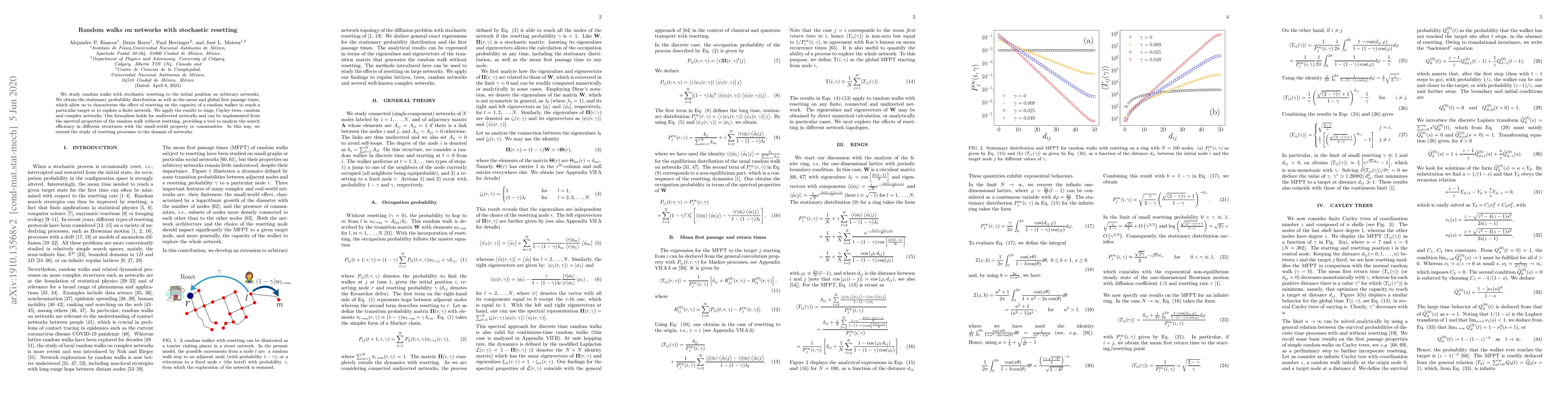 This paper explores random walks on networks with stochastic resetting, deriving the stationary distribution and mean first passage times to assess the impact of resetting on exploration and target reaching. The findings apply to various network types, offering a method to evaluate search efficiency based on spectral properties.