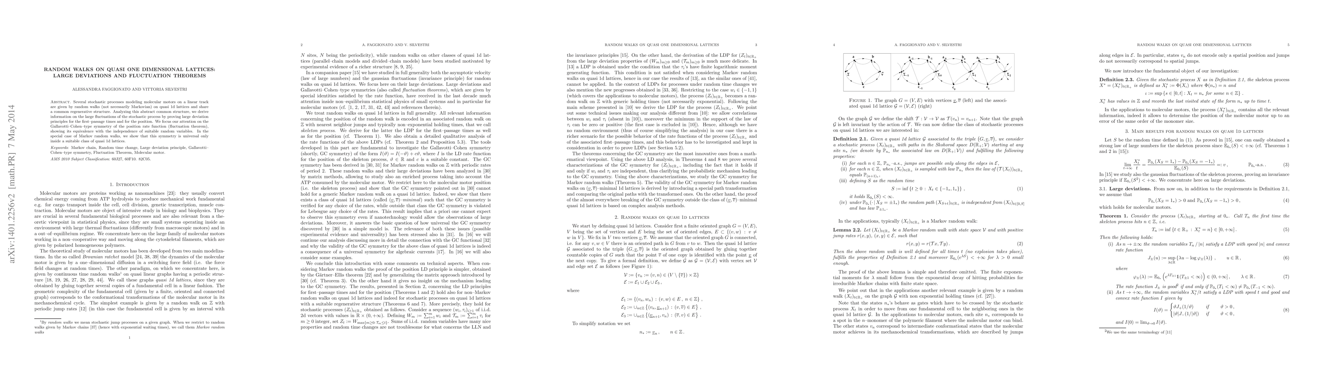 Several stochastic processes modeling molecular motors on a linear track are given by random walks (not necessarily Markovian) on quasi 1d lattices and share a common regenerative structure. Analyzing this abstract common structure, we derive information on the large fluctuations of the stochastic process by proving large deviation principles for the first--passage times and for the position. We focus our attention on the Gallavotti-Cohen-type symmetry of the position rate function (fluctuation theorem), showing its equivalence with the independence of suitable random variables. In the special case of Markov random walks, we show that this symmetry is universal only inside a suitable class of quasi 1d lattices.