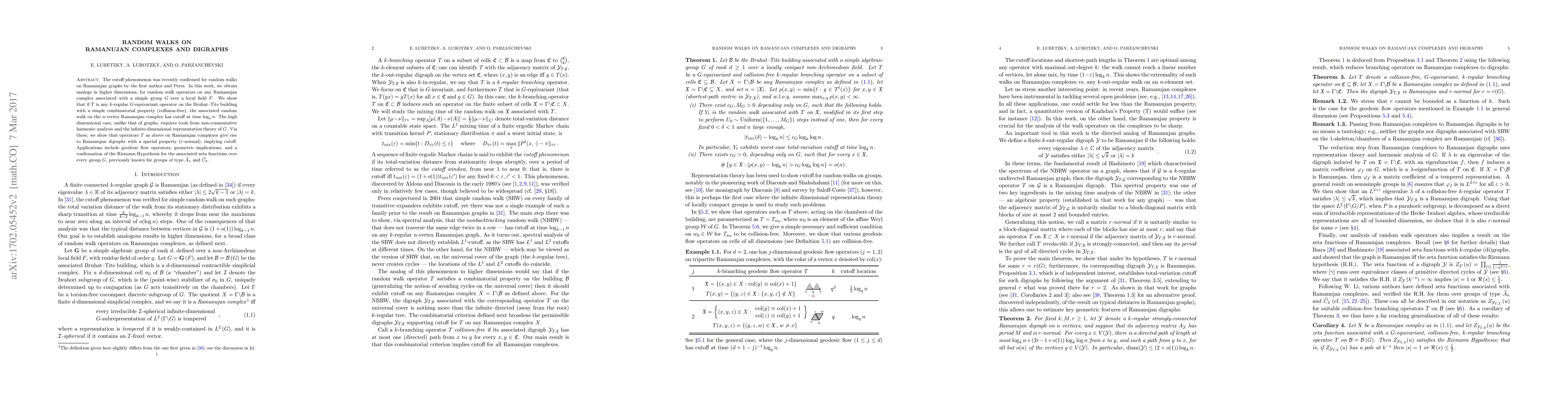 This paper studies random walks on Ramanujan complexes derived from simple groups over local fields, proving cutoff phenomena at time $\log_k n$ for $k$-regular $G$-equivariant operators. It utilizes non-commutative harmonic analysis and representation theory to establish results that extend to Ramanujan digraphs, confirming the Riemann Hypothesis for associated zeta functions.