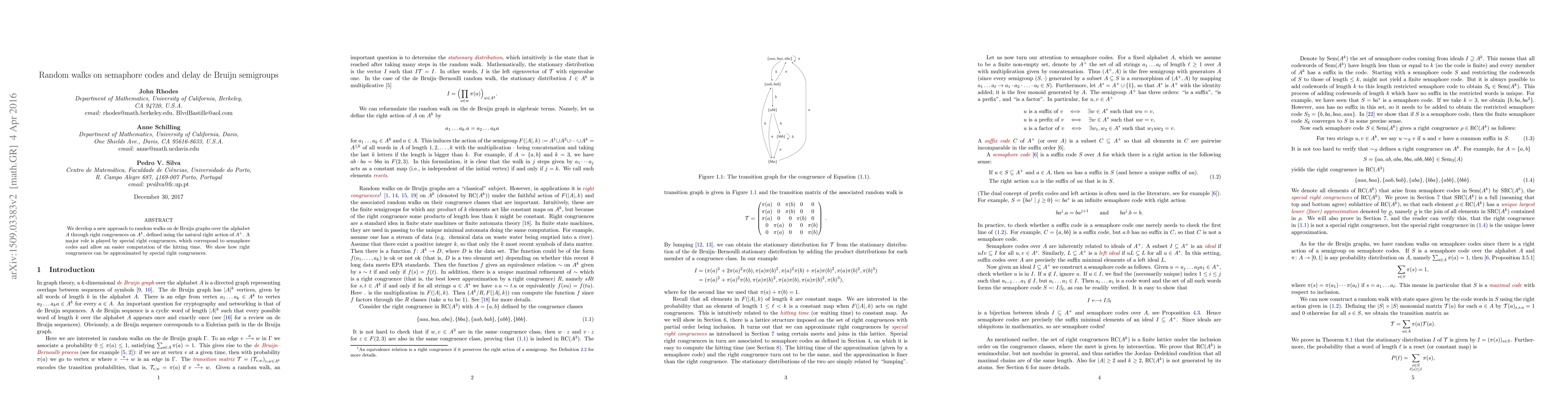 This paper introduces a novel method for random walks on de Bruijn graphs using right congruences on $A^k$ and semaphore codes, simplifying the computation of hitting time. It demonstrates how these right congruences can be approximated by special right congruences.