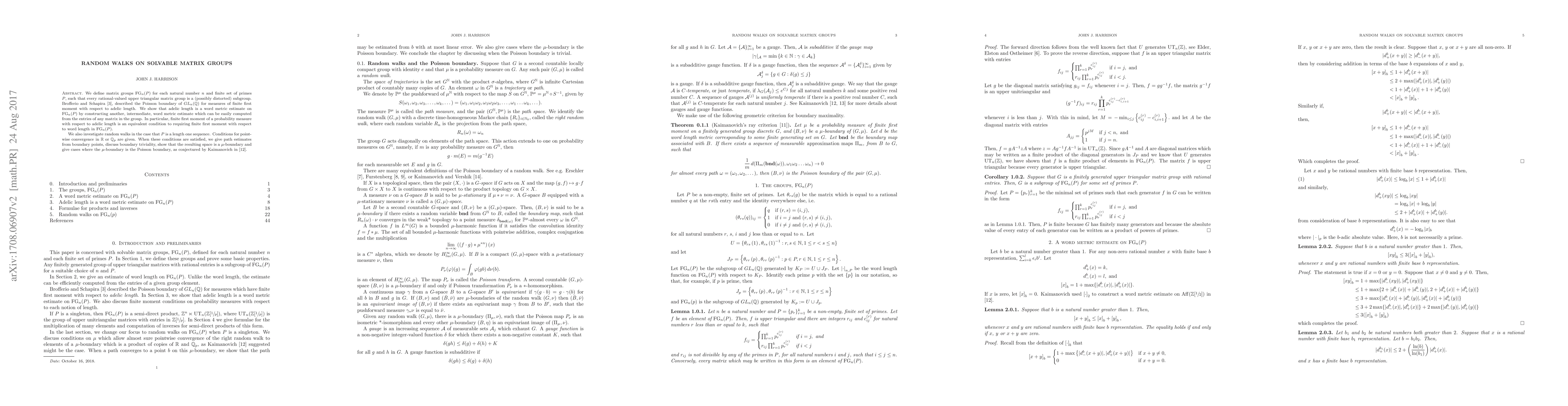 We define matrix groups $FG_n(P)$ for each natural number $n$ and finite set of primes $P$, such that every rational-valued upper triangular matrix group is a (possibly distorted) subgroup. Brofferio and Schapira [Brofferio2011poisson], described the \PF boundary of $GL_n (\mathbb{Q})$ for measures of finite first moment with respect to adelic length. We show that adelic length is a word metric estimate on $FG_n(P)$ by constructing another, intermediate, word metric estimate which can be easily computed from the entries of any matrix in the group. In particular, finite first moment of a probability measure with respect to adelic length is an equivalent condition to requiring finite first moment with respect to word length in $FG_n(P)$. We also investigate random walks in the case that $P$ is a length one sequence. Conditions for pointwise convergence in $\mathbb{R}$ or $\mathbb{Q}_p$ are given. When these conditions are satisfied, we give path estimates from boundary points, discuss boundary triviality, show that the resulting space is a $\mu$-boundary and give cases where the $\mu$-boundary is the \PF boundary, as conjectured by Kaimanovich.