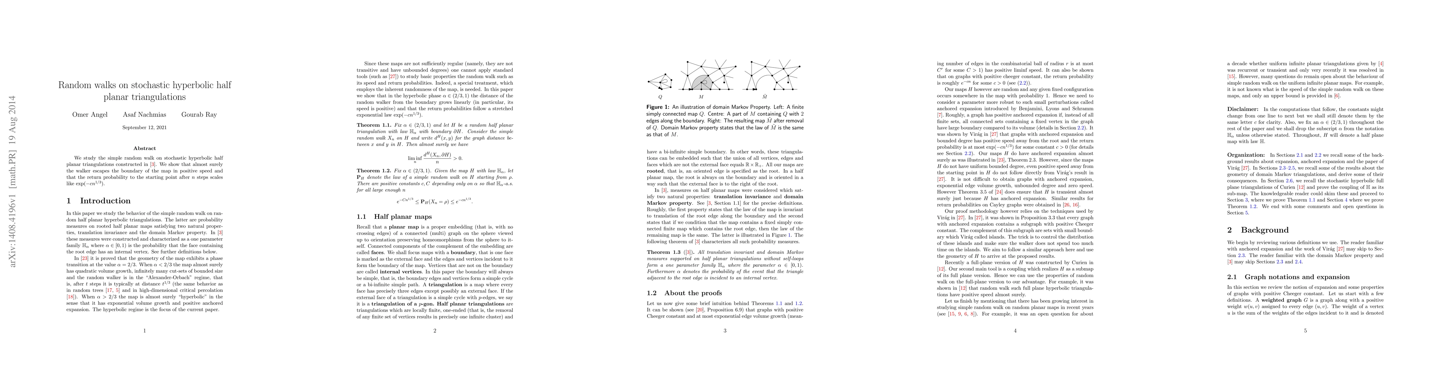 We study the simple random walk on stochastic hyperbolic half planar triangulations constructed in Angel and Ray [3]. We show that almost surely the walker escapes the boundary of the map in positive speed and that the return probability to the starting point after n steps scales like $\exp(-cn^{1/3})$.