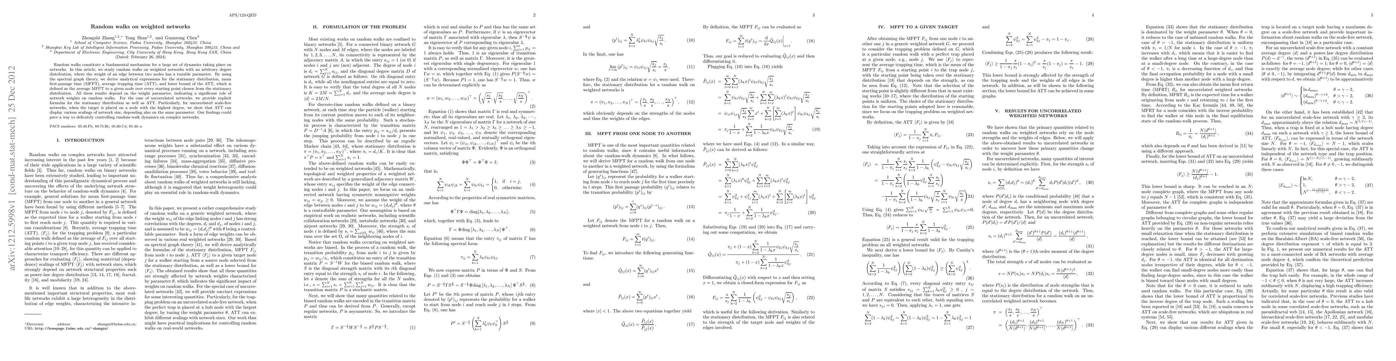This paper investigates random walks on weighted networks using spectral graph theory to derive analytical expressions for the stationary distribution, mean first-passage time, and average trapping time, all of which depend on the edge weights. It reveals significant impacts of network weights on random walk dynamics, especially in uncorrelated scale-free networks, where the average trapping time can exhibit various scaling behaviors based on the weight parameter.