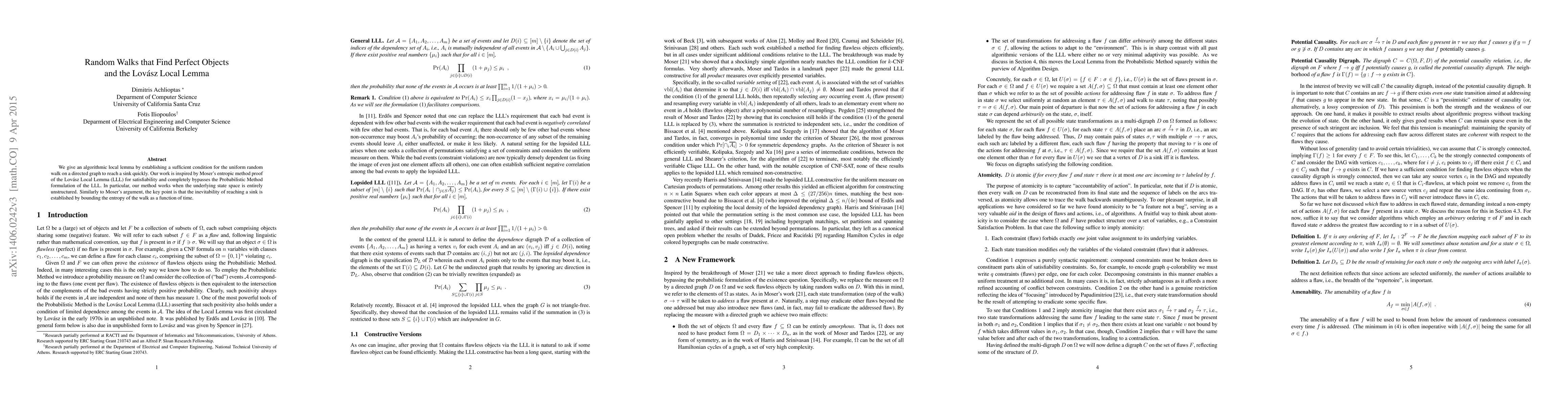This paper presents an algorithmic local lemma using a uniform random walk on a directed graph to quickly reach a sink, inspired by Moser's entropic proof of the Lovász Local Lemma. It avoids the Probabilistic Method and focuses on entropy bounds to handle unstructured state spaces.