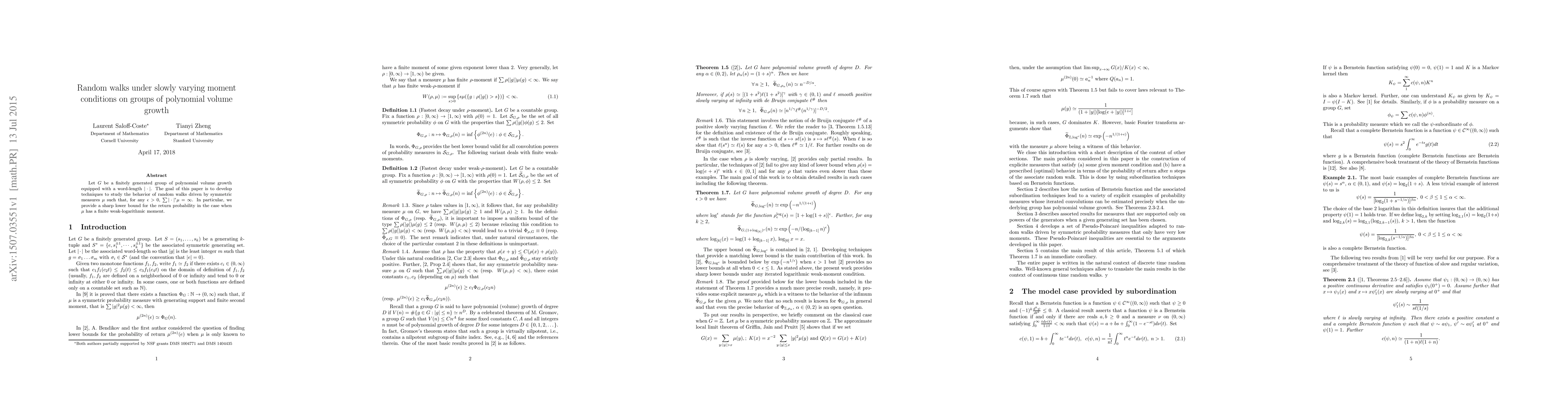 This paper develops techniques to analyze the behavior of random walks on finitely generated groups with polynomial volume growth, focusing on symmetric measures with slowly varying moments. It provides a sharp lower bound for return probabilities under conditions where the measure has a finite weak-logarithmic moment.