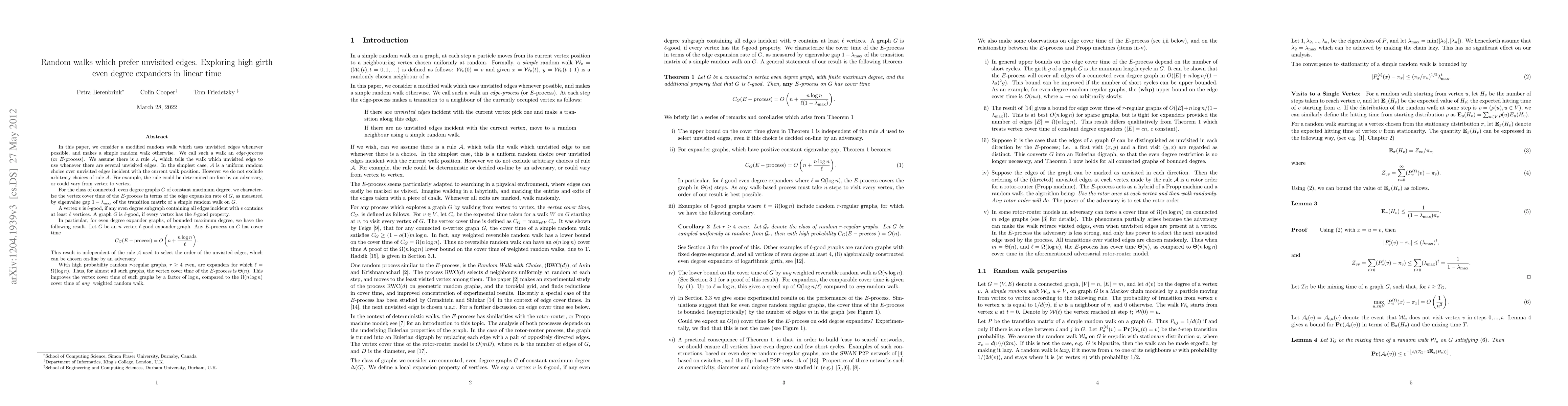 We consider a modified random walk which uses unvisited edges whenever possible, and makes a simple random walk otherwise. We call such a walk an edge-process. We assume there is a rule A, which tells the walk which unvisited edge to use whenever there is a choice. In the simplest case, A is a uniform random choice over unvisited edges incident with the current walk position. However we do not exclude arbitrary choices of rule A. For example, the rule could be determined on-line by an adversary, or could vary from vertex to vertex. For even degree expander graphs, of bounded maximum degree, we have the following result. Let G be an n vertex even degree expander graph, for which every vertex is in at least one vertex induced cycle of length L. Any edge-process on G has cover time (n+ (n log n)/L). This result is independent of the rule A used to select the order of the unvisited edges, which can be chosen on-line by an adversary. As an example, With high probability, random r-regular graphs, (r at least 4, even), are expanders for which L = Omega(log n). Thus, for almost all such graphs, the vertex cover time of the edge-process is Theta(n). This improves the vertex cover time of such graphs by a factor of log n, compared to the Omega(n log n) cover time of any weighted random walk.