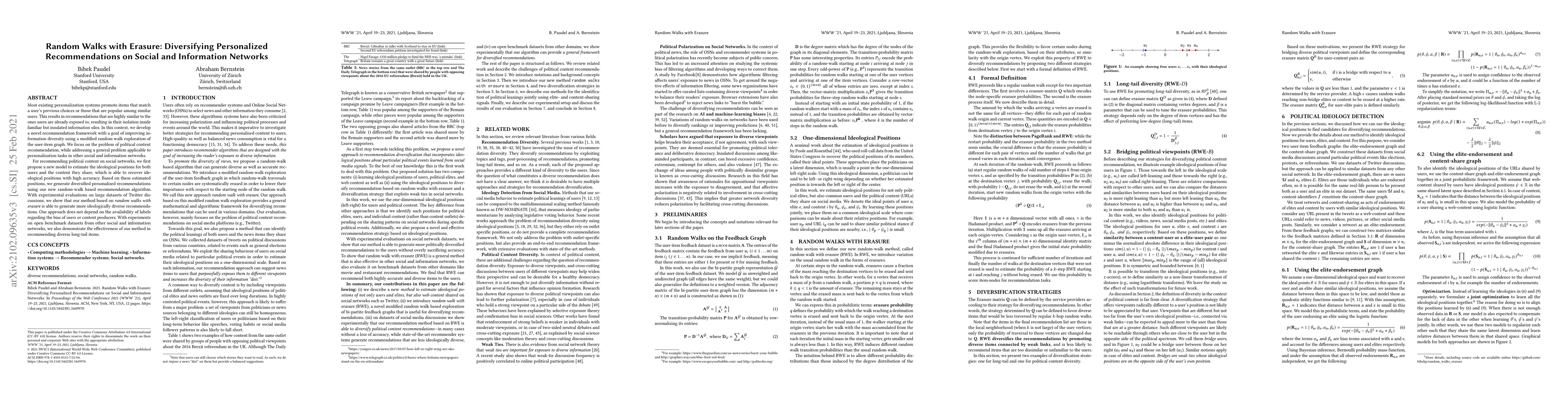 A new recommendation framework using random walks with erasure improves information diversity in social networks by generating more ideologically diverse political content recommendations. This approach does not rely on user or content bias labels.