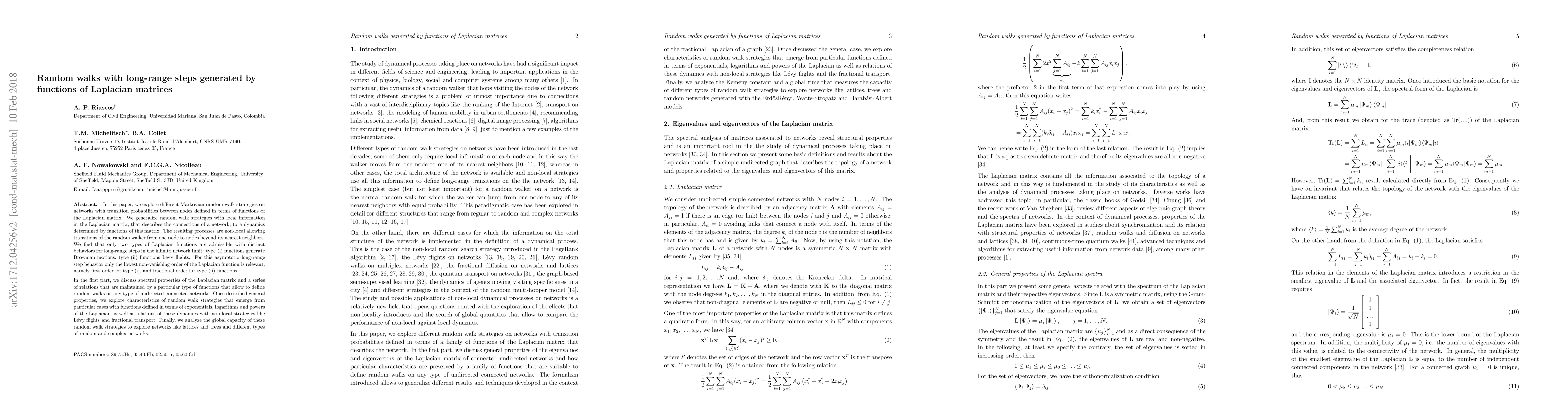 In this paper, we explore different Markovian random walk strategies on networks with transition probabilities between nodes defined in terms of functions of the Laplacian matrix. We generalize random walk strategies with local information in the Laplacian matrix, that describes the connections of a network, to a dynamics determined by functions of this matrix. The resulting processes are non-local allowing transitions of the random walker from one node to nodes beyond its nearest neighbors. We find that only two types of Laplacian functions are admissible with distinct behaviors for long-range steps in the infinite network limit: type (i) functions generate Brownian motions, type (ii) functions L\'evy flights. For this asymptotic long-range step behavior only the lowest non-vanishing order of the Laplacian function is relevant, namely first order for type (i), and fractional order for type (ii) functions. In the first part, we discuss spectral properties of the Laplacian matrix and a series of relations that are maintained by a particular type of functions that allow to define random walks on any type of undirected connected networks. Once described general properties, we explore characteristics of random walk strategies that emerge from particular cases with functions defined in terms of exponentials, logarithms and powers of the Laplacian as well as relations of these dynamics with non-local strategies like L\'evy flights and fractional transport. Finally, we analyze the global capacity of these random walk strategies to explore networks like lattices and trees and different types of random and complex networks.