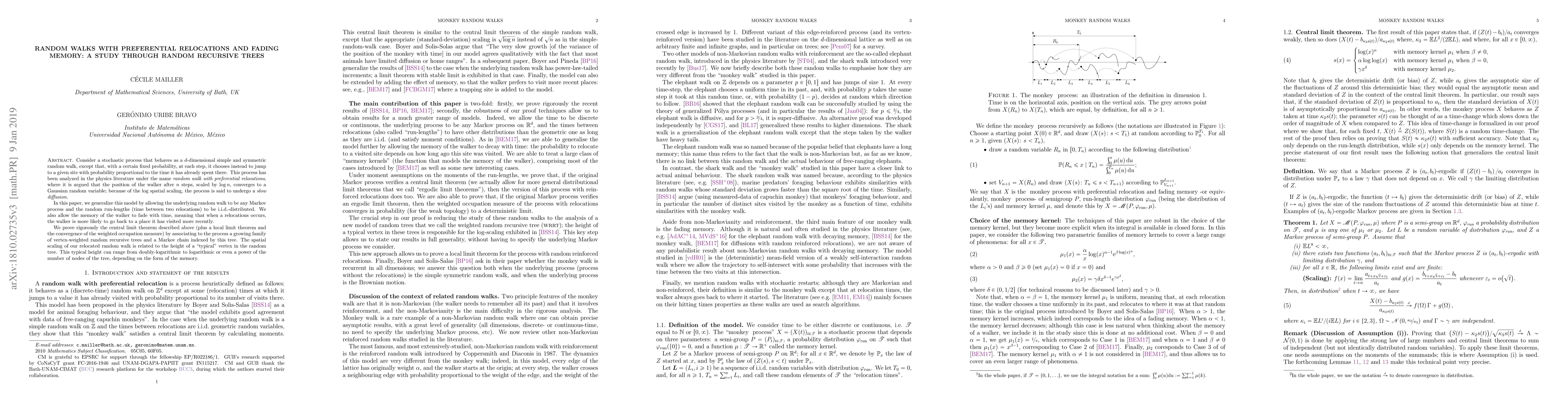 This paper studies a generalized random walk model with preferential relocations and fading memory, proving a central limit theorem and convergence of the occupation measure. It uses random recursive trees and Markov chains to analyze the spatial scaling, which varies based on the walker's memory decay.