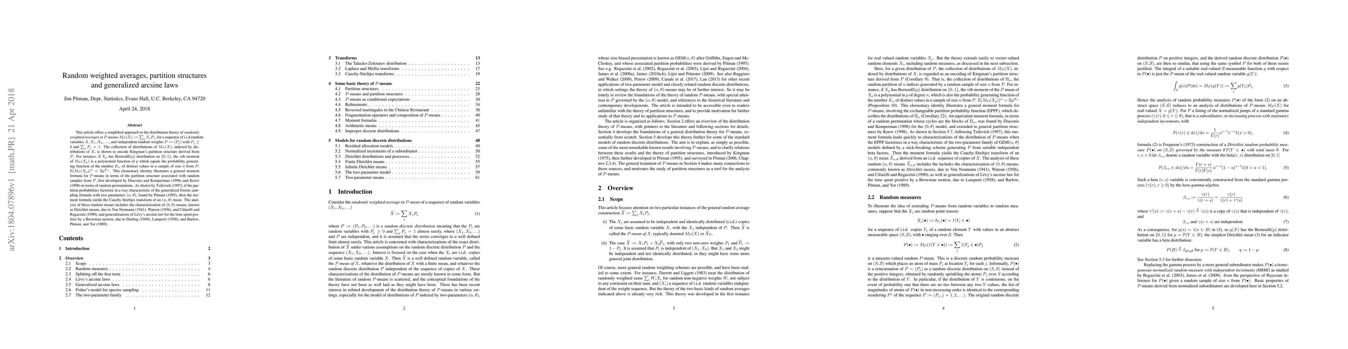 This article offers a simplified approach to the distribution theory of randomly weighted averages or $P$-means $M_P(X):= \sum_{j} X_j P_j$, for a sequence of i.i.d.random variables $X, X_1, X_2, \ldots$, and independent random weights $P:= (P_j)$ with $P_j \ge 0$ and $\sum_{j} P_j = 1$. The collection of distributions of $M_P(X)$, indexed by distributions of $X$, is shown to encode Kingman's partition structure derived from $P$. For instance, if $X_p$ has Bernoulli$(p)$ distribution on $\{0,1\}$, the $n$th moment of $M_P(X_p)$ is a polynomial function of $p$ which equals the probability generating function of the number $K_n$ of distinct values in a sample of size $n$ from $P$: $E (M_P(X_p))^n = E p^{K_n}$. This elementary identity illustrates a general moment formula for $P$-means in terms of the partition structure associated with random samples from $P$, first developed by Diaconis and Kemperman (1996) and Kerov (1998) in terms of random permutations. As shown by Tsilevich (1997) if the partition probabilities factorize in a way characteristic of the generalized Ewens sampling formula with two parameters $(\alpha,\theta)$, found by Pitman (1992), then the moment formula yields the Cauchy-Stieltjes transform of an $(\alpha,\theta)$ mean. The analysis of these random means includes the characterization of $(0,\theta)$-means, known as Dirichlet means, due to Von Neumann (1941), Watson (1956) and Cifarelli and Regazzini (1990) and generalizations of L\'evy's arcsine law for the time spent positive by a Brownian motion, due to Darling (1949) Lamperti (1958) and Barlow, Pitman and Yor (1989).