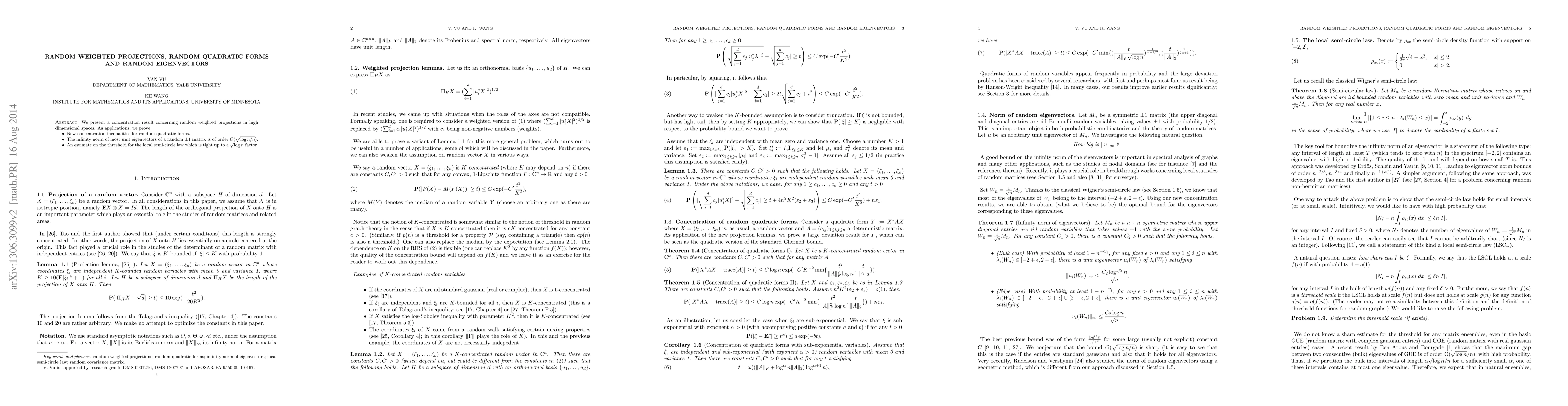 We present a concentration result concerning random weighted projections in high dimensional spaces. As applications, we prove (1) New concentration inequalities for random quadratic forms; (2) The infinity norm of most unit eigenvectors of a random $\pm 1$ matrix is of order $O( \sqrt { \log n/n})$; (3) An estimate on the threshold for the local semi-circle law which is tight up to a $\sqrt {\log n}$ factor.