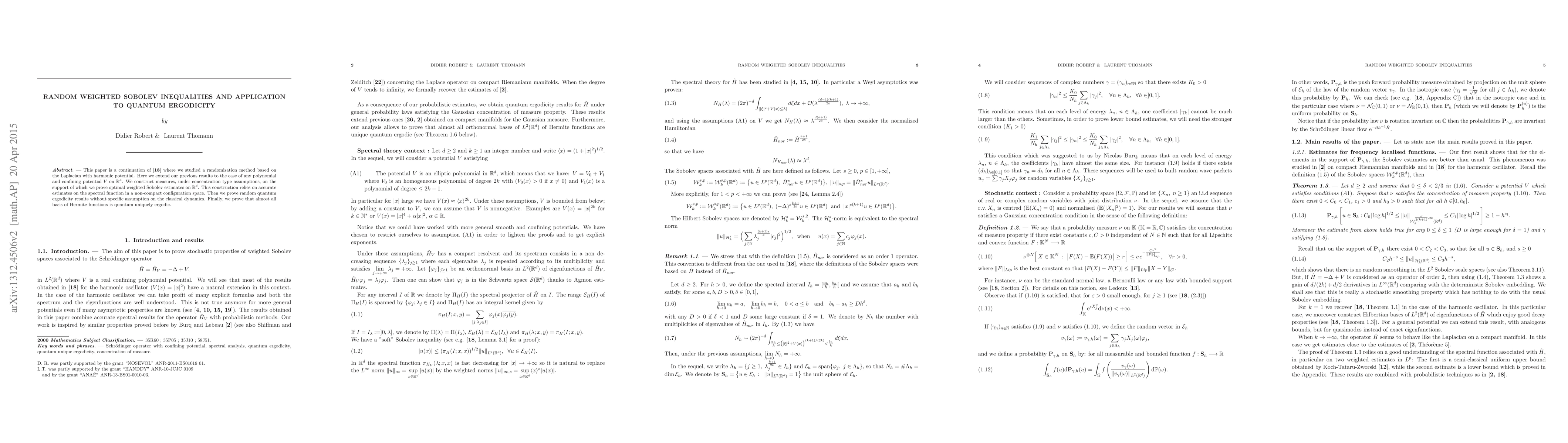 This paper extends random weighted Sobolev inequalities to polynomial potentials on $\mathbb{R}^d$, proving optimal estimates under concentration assumptions. The results support random quantum ergodicity without specific classical dynamics assumptions and show that almost all bases of Hermite functions are quantum uniquely ergodic.