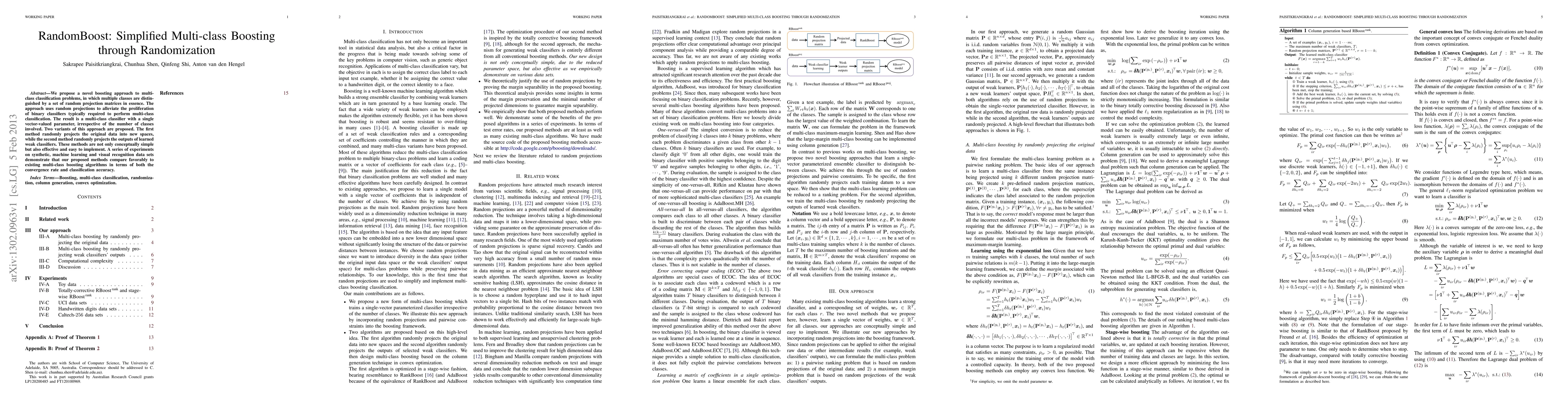 RandomBoost simplifies multi-class boosting using random projection matrices to reduce the number of binary classifiers needed. The method achieves a single vector-valued parameter for classification, regardless of the number of classes, and demonstrates competitive performance in experiments compared to existing algorithms.
