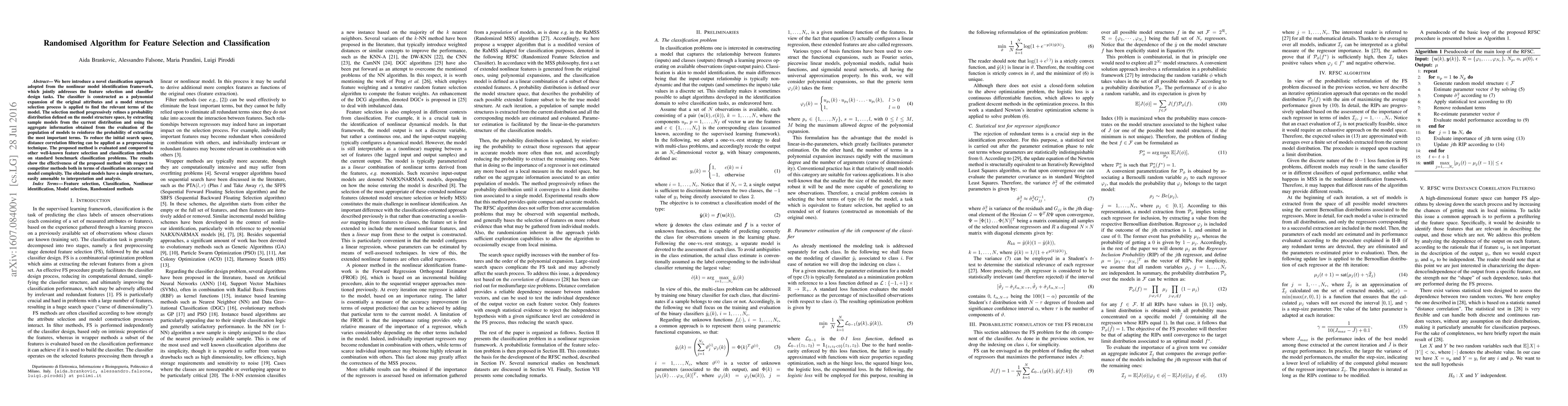 We here introduce a novel classification approach adopted from the nonlinear model identification framework, which jointly addresses the feature selection and classifier design tasks. The classifier is constructed as a polynomial expansion of the original attributes and a model structure selection process is applied to find the relevant terms of the model. The selection method progressively refines a probability distribution defined on the model structure space, by extracting sample models from the current distribution and using the aggregate information obtained from the evaluation of the population of models to reinforce the probability of extracting the most important terms. To reduce the initial search space, distance correlation filtering can be applied as a preprocessing technique. The proposed method is evaluated and compared to other well-known feature selection and classification methods on standard benchmark classification problems. The results show the effectiveness of the proposed method with respect to competitor methods both in terms of classification accuracy and model complexity. The obtained models have a simple structure, easily amenable to interpretation and analysis.