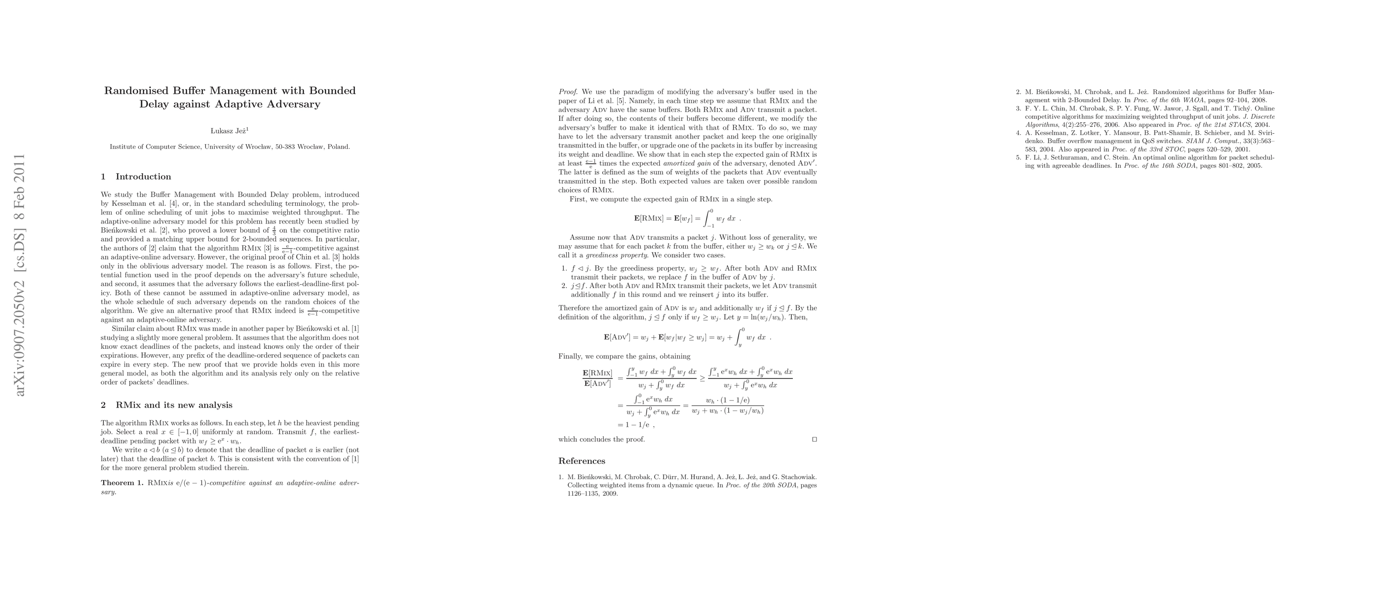 Summary: This paper presents a new analysis of the RMix algorithm for buffer management, proving its e/(e-1)-competitiveness even against adaptive online adversaries, extending its applicability to a broader scheduling problem.