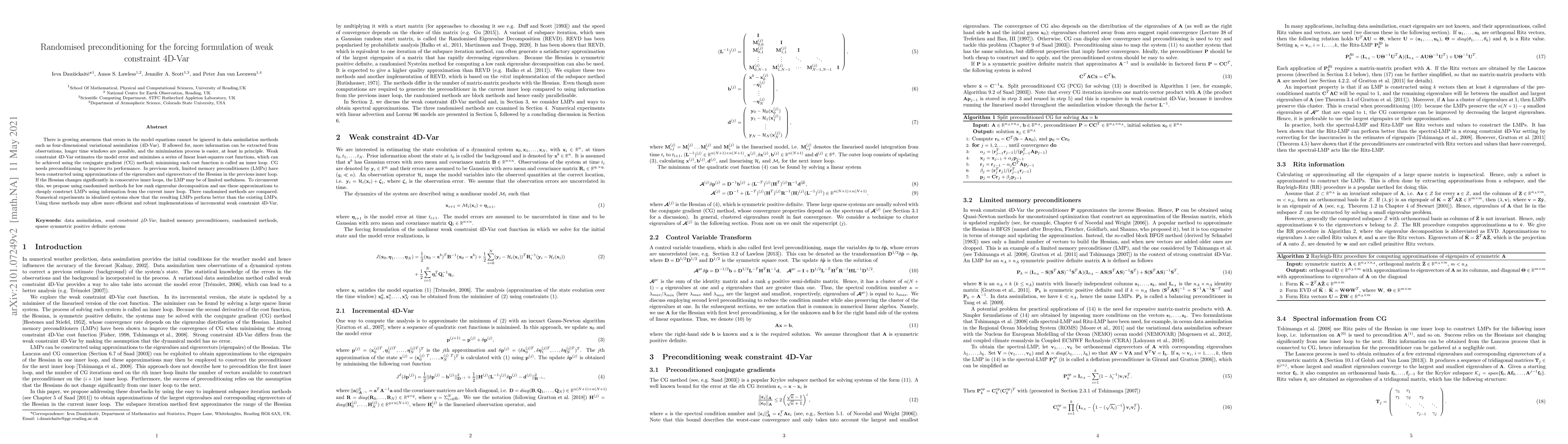 There is growing awareness that errors in the model equations cannot be ignored in data assimilation methods such as four-dimensional variational assimilation (4D-Var). If allowed for, more information can be extracted from observations, longer time windows are possible, and the minimisation process is easier, at least in principle. Weak constraint 4D-Var estimates the model error and minimises a series of linear least-squares cost functionsfunctions, which can be achieved using the conjugate gradient (CG) method; minimising each cost function is called an inner loop. CG needs preconditioning to improve its performance. In previous work, limited memory preconditioners (LMPs) have been constructed using approximations of the eigenvalues and eigenvectors of the Hessian in the previous inner loop. If the Hessian changes significantly in consecutive inner loops, the LMP may be of limited usefulness. To circumvent this, we propose using randomised methods for low rank eigenvalue decomposition and use these approximations to cheaply construct LMPs using information from the current inner loop. Three randomised methods are compared. Numerical experiments in idealized systems show that the resulting LMPs perform better than the existing LMPs. Using these methods may allow more efficient and robust implementations of incremental weak constraint 4D-Var.