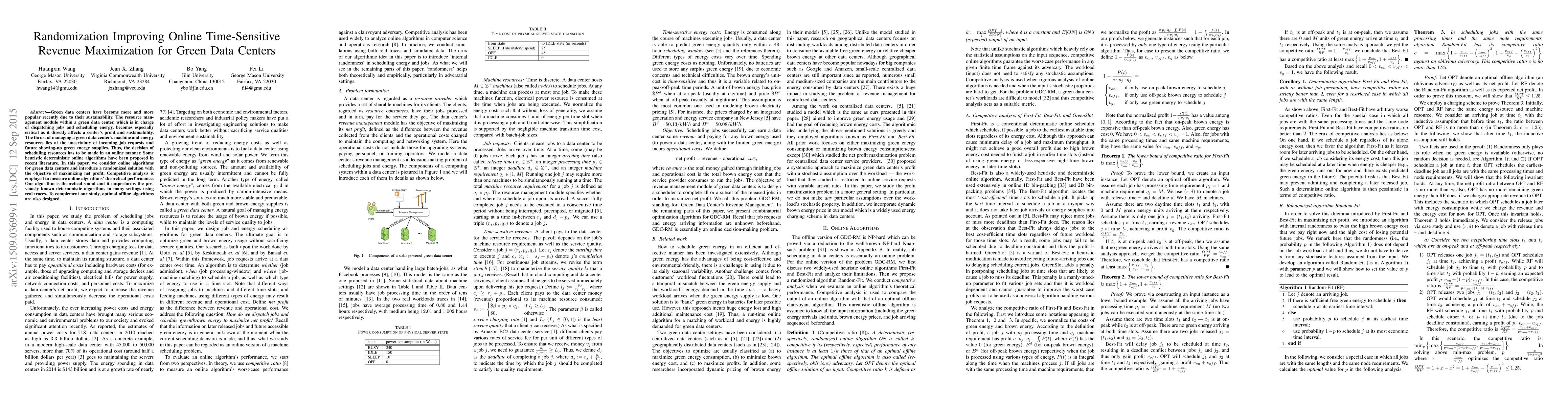 Green data centers have become more and more popular recently due to their sustainability. The resource management module within a green data center, which is in charge of dispatching jobs and scheduling energy, becomes especially critical as it directly affects a center's profit and sustainability. The thrust of managing a green data center's machine and energy resources lies at the uncertainty of incoming job requests and future showing-up green energy supplies. Thus, the decision of scheduling resources has to be made in an online manner. Some heuristic deterministic online algorithms have been proposed in recent literature. In this paper, we consider online algorithms for green data centers and introduce a randomized solution with the objective of maximizing net profit. Competitive analysis is employed to measure online algorithms' theoretical performance. Our algorithm is theoretical-sound and it outperforms the previously known deterministic algorithms in many settings using real traces. To complement our study, optimal offline algorithms are also designed.