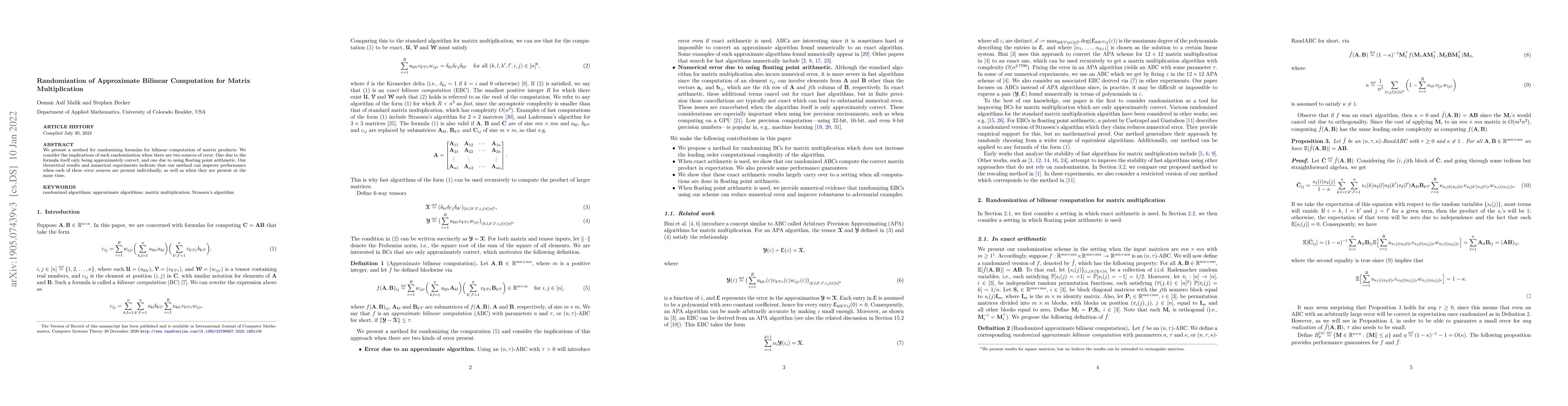 We present a method for randomizing formulas for bilinear computation of matrix products. We consider the implications of such randomization when there are two sources of error: One due to the formula itself only being approximately correct, and one due to using floating point arithmetic. Our theoretical results and numerical experiments indicate that our method can improve performance when each of these error sources are present individually, as well as when they are present at the same time.