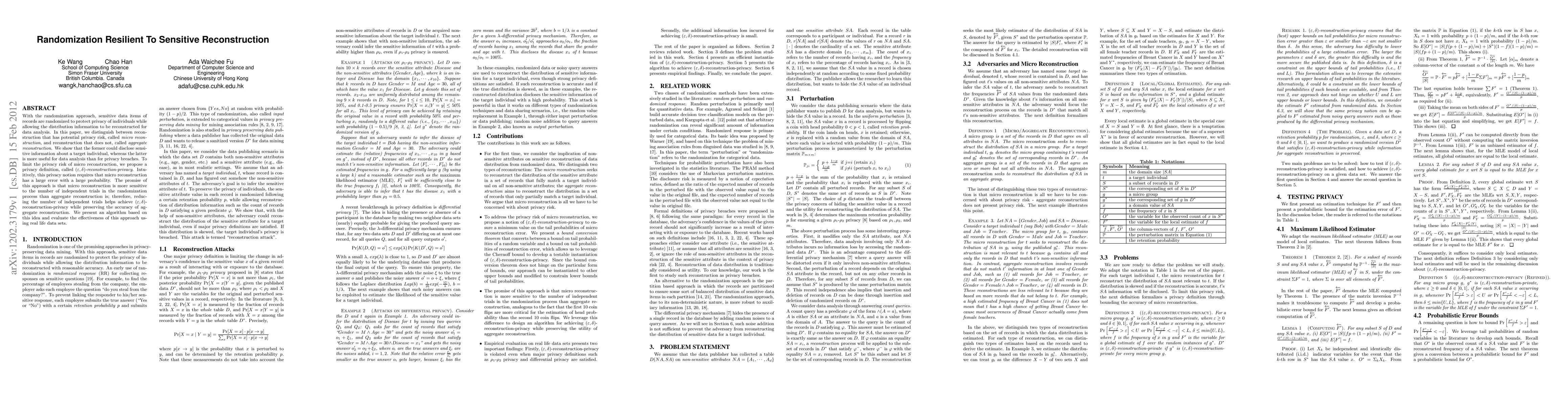 With the randomization approach, sensitive data items of records are randomized to protect privacy of individuals while allowing the distribution information to be reconstructed for data analysis. In this paper, we distinguish between reconstruction that has potential privacy risk, called micro reconstruction, and reconstruction that does not, called aggregate reconstruction. We show that the former could disclose sensitive information about a target individual, whereas the latter is more useful for data analysis than for privacy breaches. To limit the privacy risk of micro reconstruction, we propose a privacy definition, called (epsilon,delta)-reconstruction-privacy. Intuitively, this privacy notion requires that micro reconstruction has a large error with a large probability. The promise of this approach is that micro reconstruction is more sensitive to the number of independent trials in the randomization process than aggregate reconstruction is; therefore, reducing the number of independent trials helps achieve (epsilon,delta)-reconstruction-privacy while preserving the accuracy of aggregate reconstruction. We present an algorithm based on this idea and evaluate the effectiveness of this approach using real life data sets.