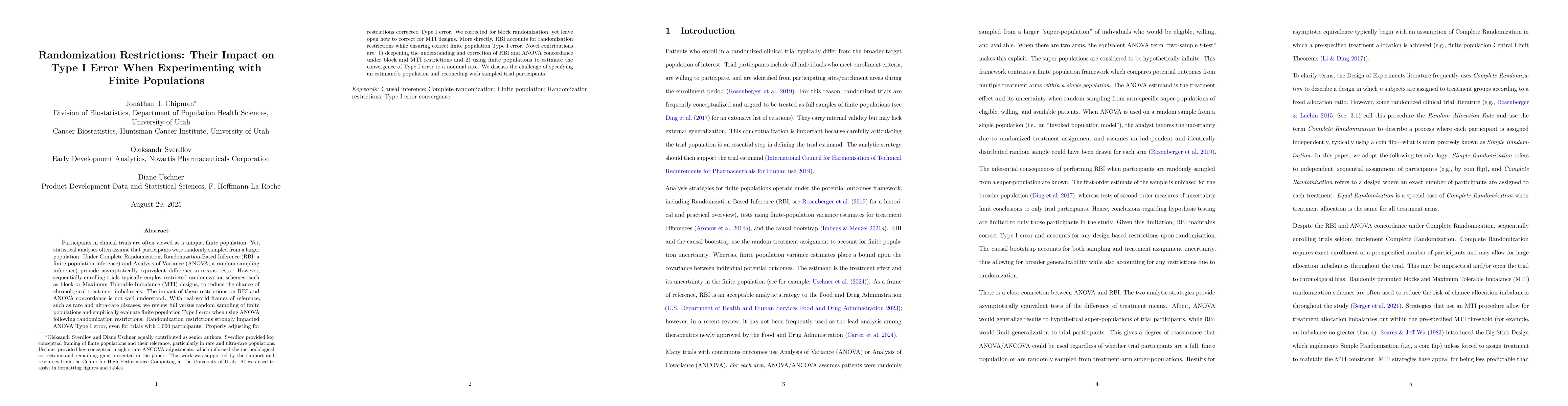 Participants in clinical trials are often viewed as a unique, finite population. Yet, statistical analyses often assume that participants were randomly sampled from a larger population. Under Complete Randomization, Randomization-Based Inference (RBI; a finite population inference) and Analysis of Variance (ANOVA; a random sampling inference) provide asymptotically equivalent difference-in-means tests. However, sequentially-enrolling trials typically employ restricted randomization schemes, such as block or Maximum Tolerable Imbalance (MTI) designs, to reduce the chance of chronological treatment imbalances. The impact of these restrictions on RBI and ANOVA concordance is not well understood. With real-world frames of reference, such as rare and ultra-rare diseases, we review full versus random sampling of finite populations and empirically evaluate finite population Type I error when using ANOVA following randomization restrictions. Randomization restrictions strongly impacted ANOVA Type I error, even for trials with 1,000 participants. Properly adjusting for restrictions corrected Type I error. We corrected for block randomization, yet leave open how to correct for MTI designs. More directly, RBI accounts for randomization restrictions while ensuring correct finite population Type I error. Novel contributions are: 1) deepening the understanding and correction of RBI and ANOVA concordance under block and MTI restrictions and 2) using finite populations to estimate the convergence of Type I error to a nominal rate. We discuss the challenge of specifying an estimand's population and reconciling with sampled trial participants.