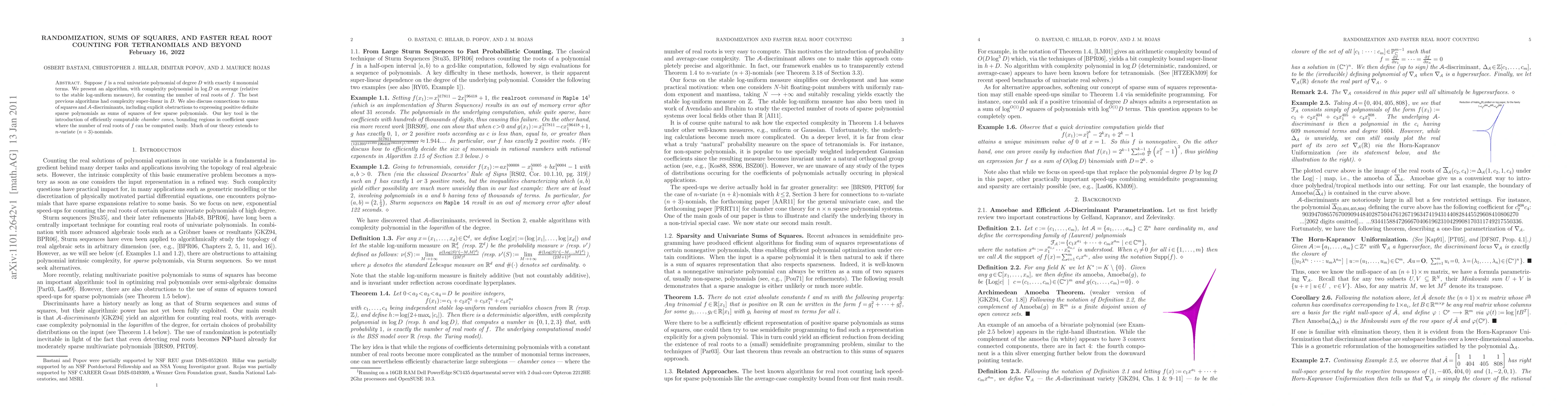 Researchers developed an algorithm to efficiently count real roots of polynomials with 4 monomial terms, improving on previous super-linear complexity algorithms, and extended the theory to n-variate (n+3)-nomials.